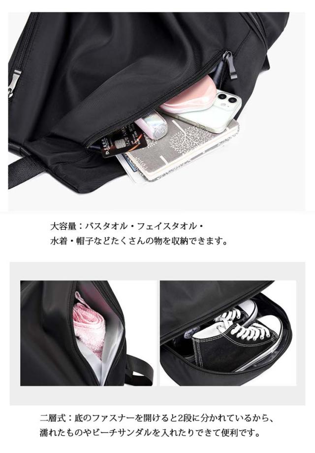 | 両サイドにメッシュのポケットが付いています。折りたたみ傘やペットボトルを入れることも可能です。 ナイロン素材で、軽くて通気性も良く丈夫!濡れたものを入れて帰っても、すぐに乾くのでお手入れがしやすく、また、生地自体にある程度の強度が見込めるため長持ちします。 二層式:底のファスナーを開けると2段に分かれているから、濡れたものやビーチサンダルを入れたりできて便利です。 大容量:バスタオル・フェイスタオル・水着・帽子などたくさんの物を収納できます。 水泳、サッカー、キャンプ、ショッピング、学校、登山、旅行など様々な場面で活躍します。カジュアル風あふれて旅行に快適さを与えます。 | |