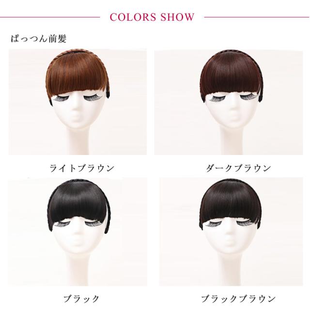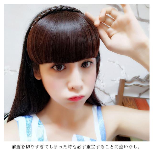 | 手軽にかわいくイメチェンできる前髪ウィッグ。 三つ編みカチューシャ前髪が付いているデザイン、カチューシャをつけるだけ、いつもさらさらステキな前髪をゲット。 前髪を切りすぎてしまった時も必ず重宝すること間違いなし。 ふんわり厚めのバングで大人可愛い。ボリュームアップにも◎ 小顔効果が期待できるぱっつん前髪と斜め前髪の2TYPEからお選びいただけます。 ダークブラウン ライトブラウン ブラック ブラックブラウンの4色展開、地毛の髪色に合わせてお選びいただけます。 | |
