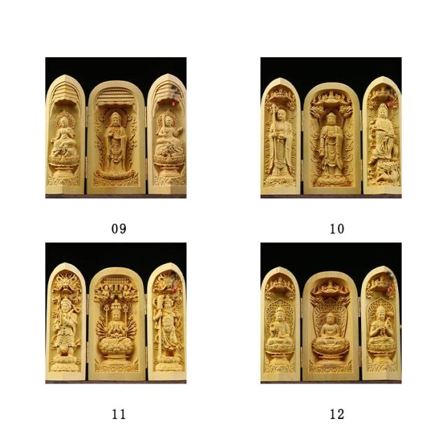 | 手のひらサイズで持ち歩きもでき 行く先々で扉を開き三尊に手を合わせることができて便利です 机や棚などに簡単に設置でき、自分用の仏様としてお祀りできます ※天然木使用のため、それぞれ違った風合いを持ち 木目や色が様々です。 節や木目が濃く、汚れに見える場合もございます、 天然木の味としてご理解をいただければと思います。 | |