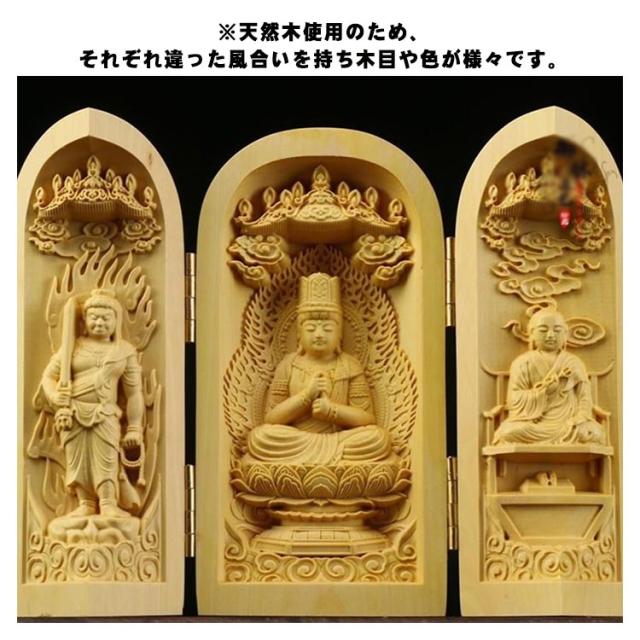 木彫仏像 彫刻 ツゲ 真言宗大日三尊 三開仏 仏龕 仏壇 仏箱 大日三尊 真言宗三尊 大日如来 弘法大師 不動明王 幸運の神 お釈迦様 福呂寿 観音 阿弥陀様 三開仏 密教の教主