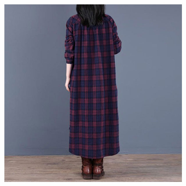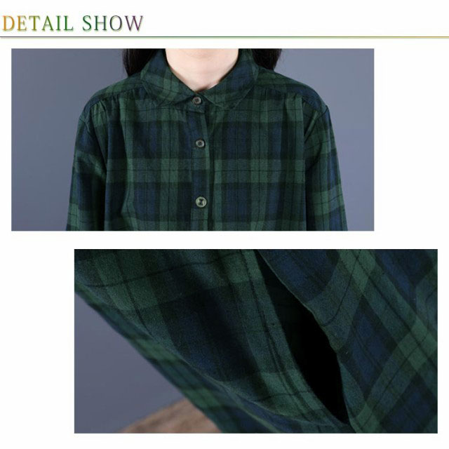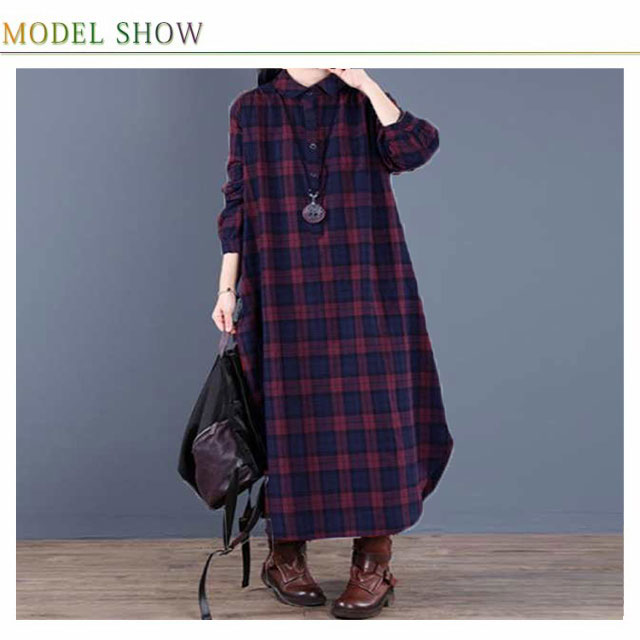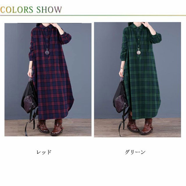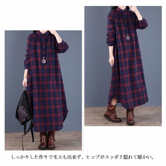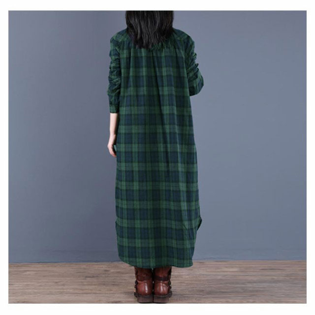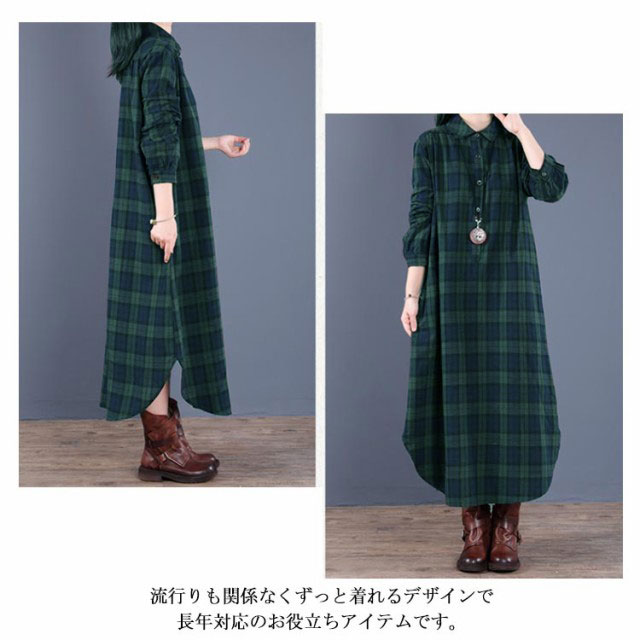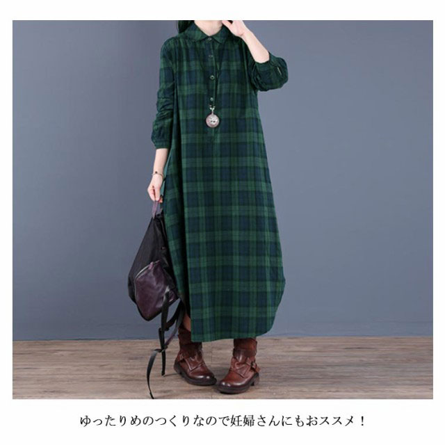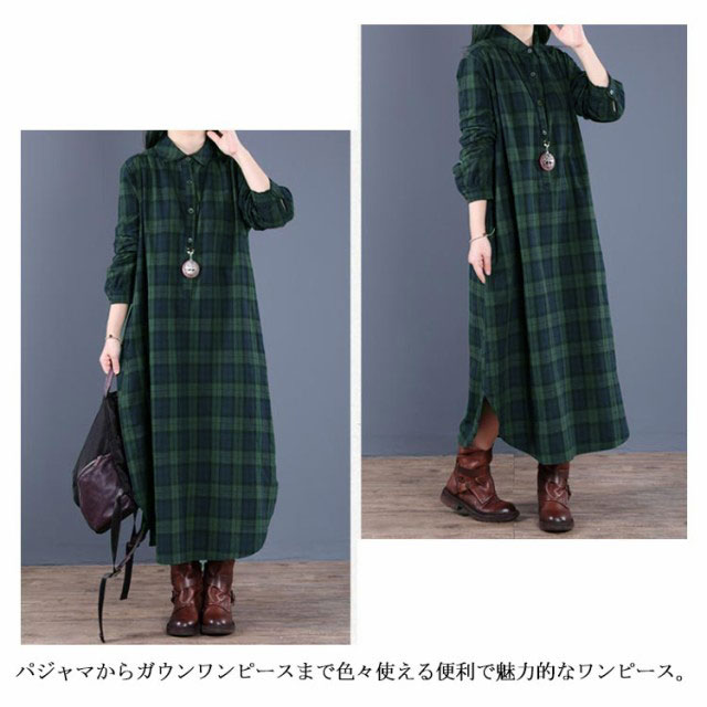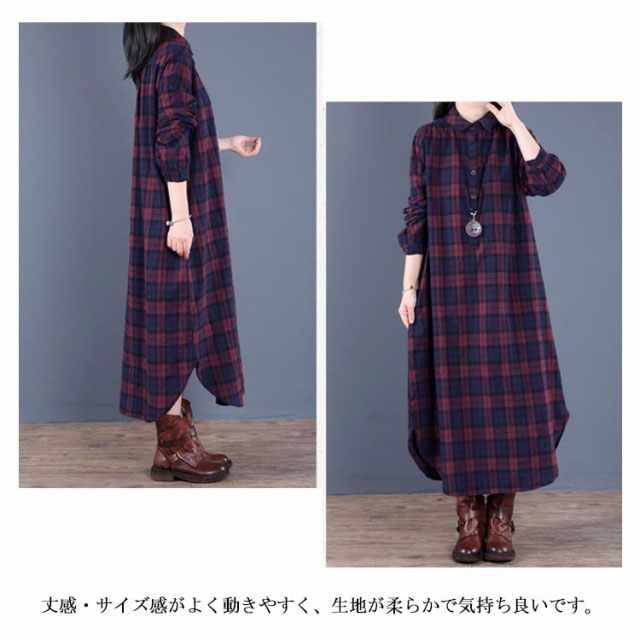 (送料無料)チェック柄 シャツワンピース ロングワンピース シャツワンピ ガウンシャツ ネルシャツ 長袖 ワンピ ラウンドテール プルオーバー 大きいサイズ ゆったり 体型カバー 着痩せ 妊婦 産後 シンプル カジュアル エスニック