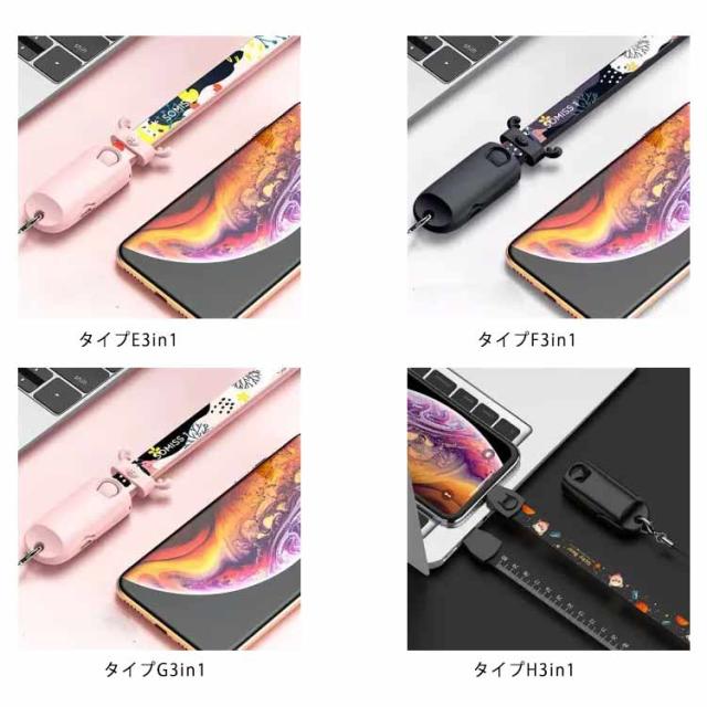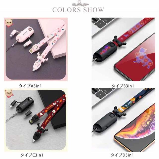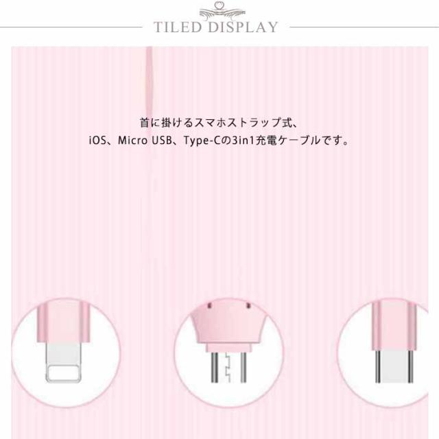 iOS/Micro USB/USB Type-C 3in1 充電ケーブル ライトニングケーブル microusb typec スマホ ストラップ iPhone8 iPhone12 SE Android Xpeira AQUOS arrows Galaxy