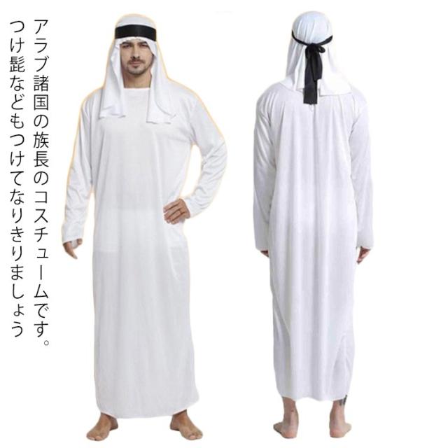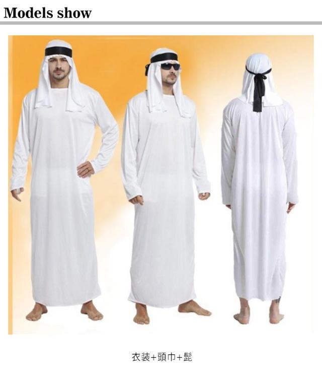 ハロウィン コスプレ アラブ ドバイ アラビア 商人 首長 3点セット 衣装+頭巾+髭 アラブの王子 砂漠の王子 アラブ服 中東 商人 石油王 男性用 メンズ 仮装 コスプレ衣装