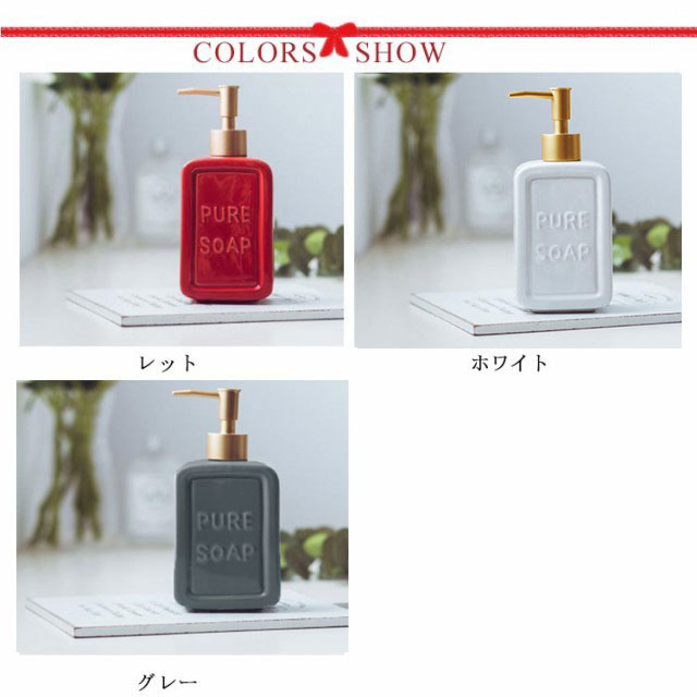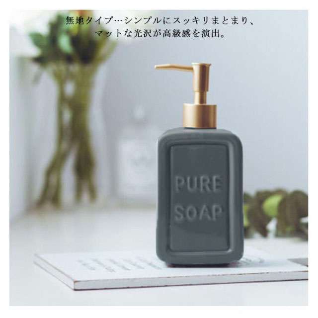 | 生活感が出がちな水周りに 置くだけで存在感のある、セラミック製のお洒落なディスペンサー 市販の液体ハンドソープをはじめ、 シャンプーやトリートメント、化粧水や乳液などでもご使用いただけます。 洗面台だけでなく、化粧台、お風呂場にもなじむデザイン性の高い商品です。 無地タイプ…シンプルにスッキリまとまり、マットな光沢が高級感を演出。 | |