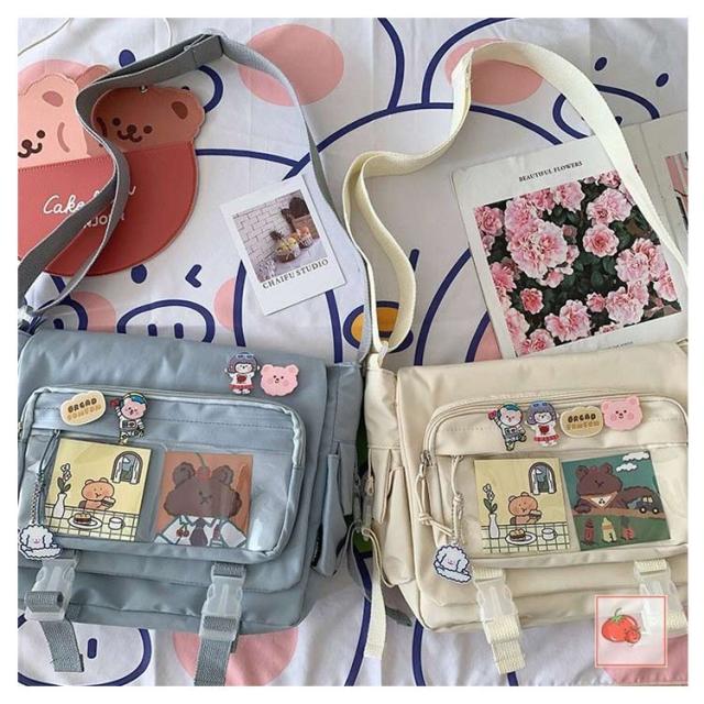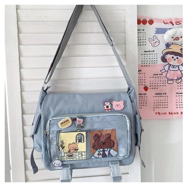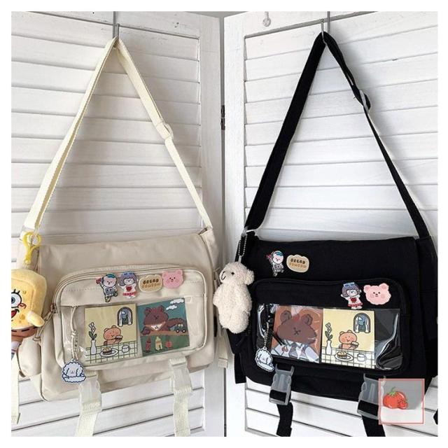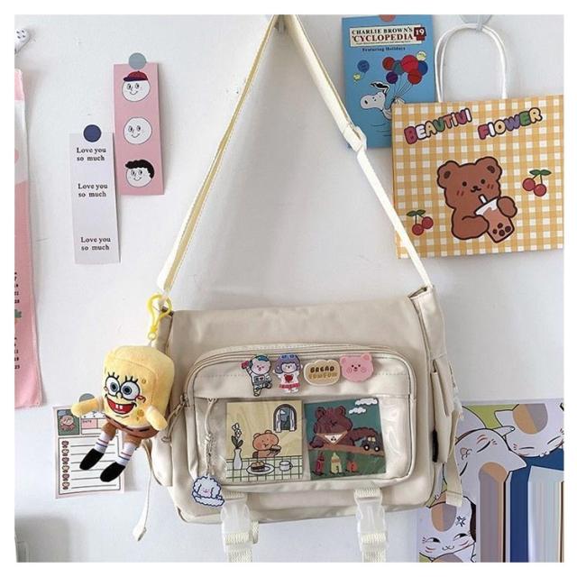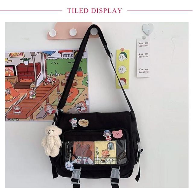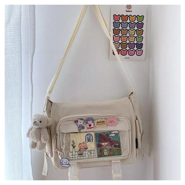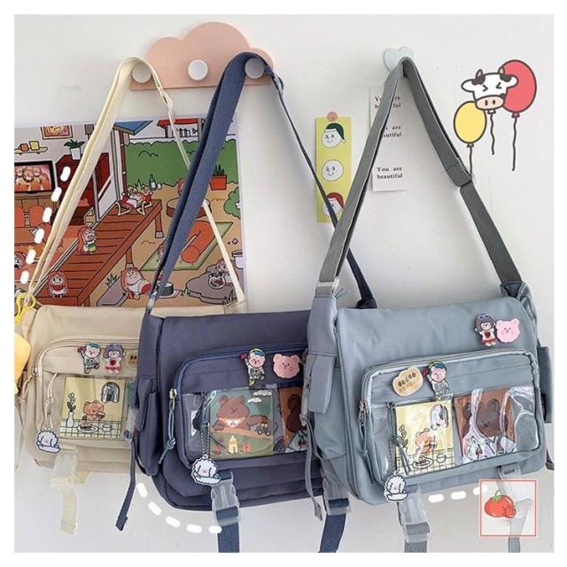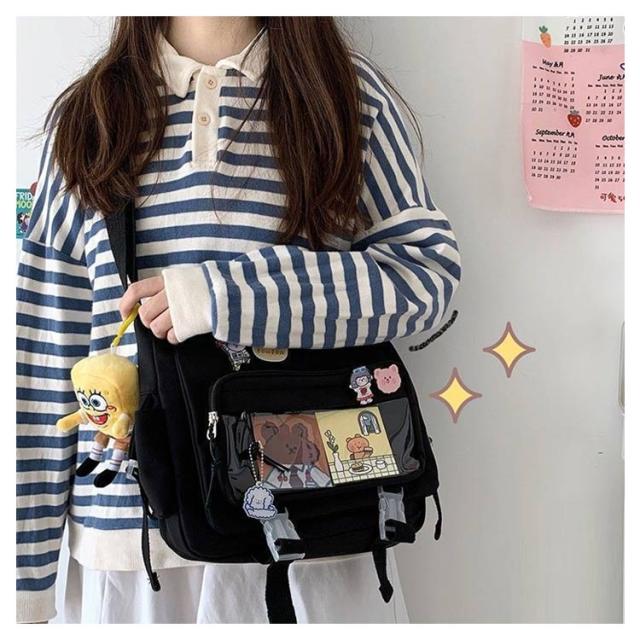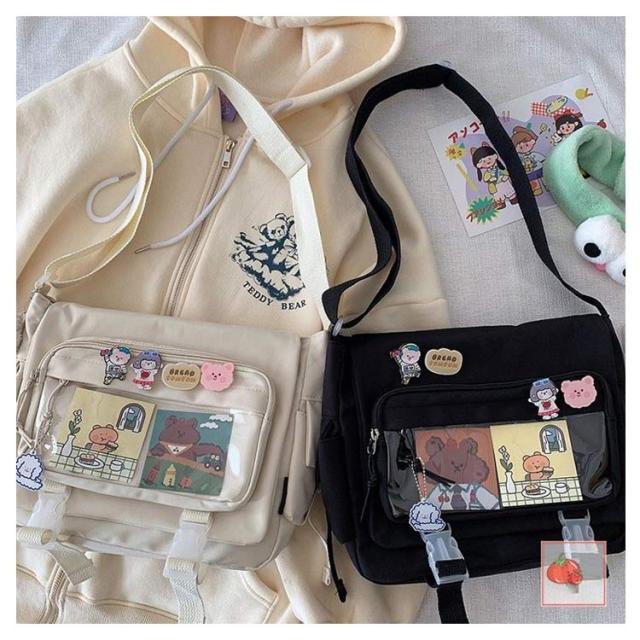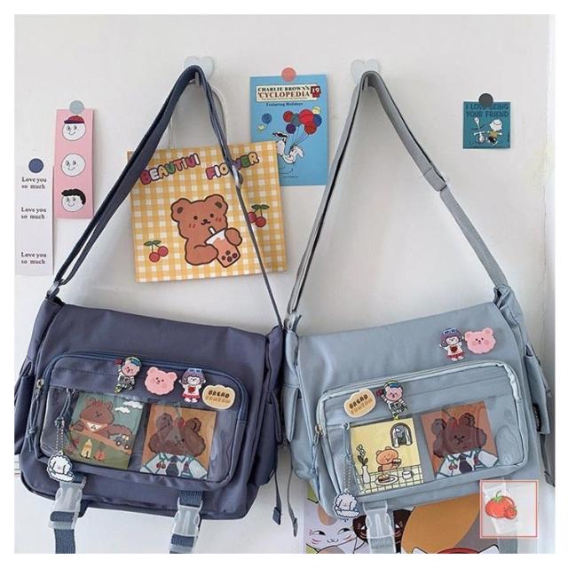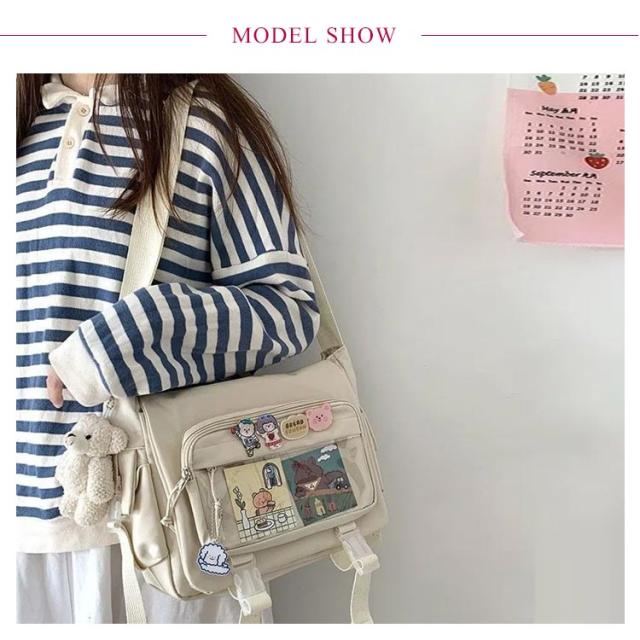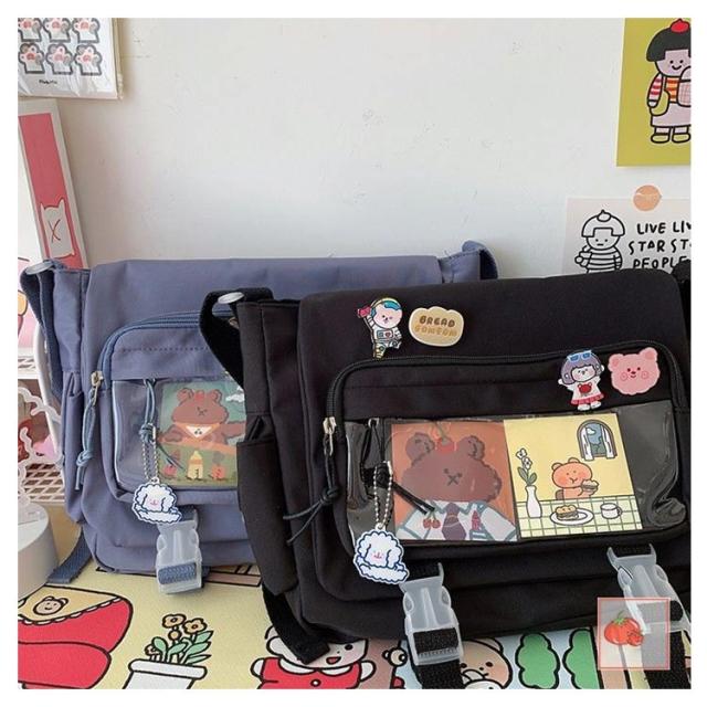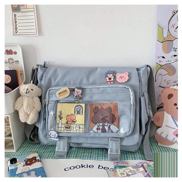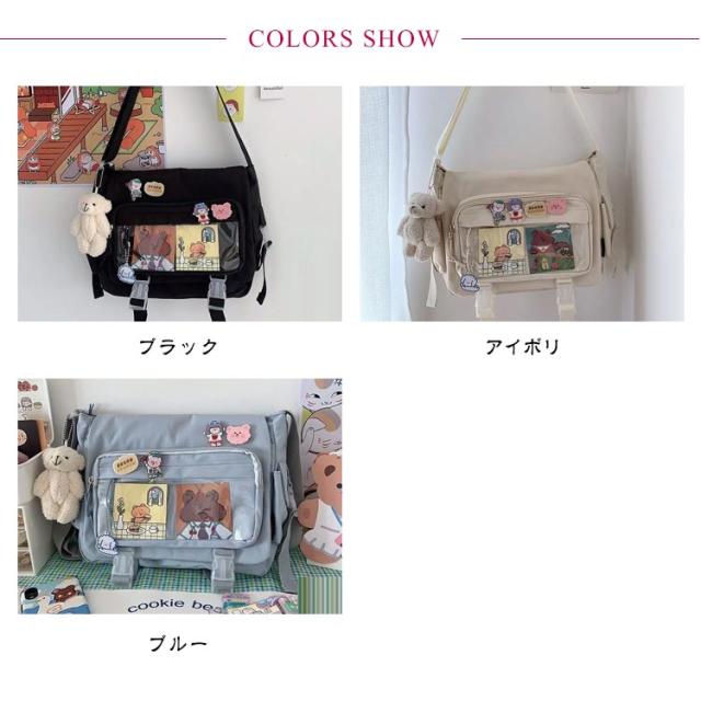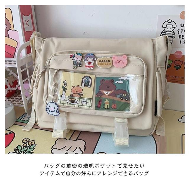 | 軽量で大容量な学生バッグ。 便利な仕分けポケット。 バッグの前面の透明ポケットで見せたいアイテムで自分の好みにアレンジできるバッグ。 通学、遠足、イベント、普段のお出かけには大活躍。 | |