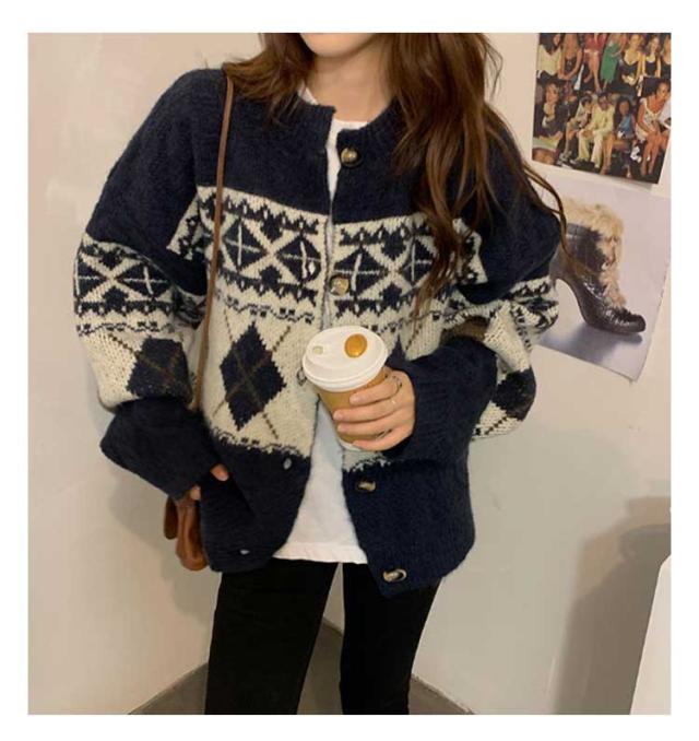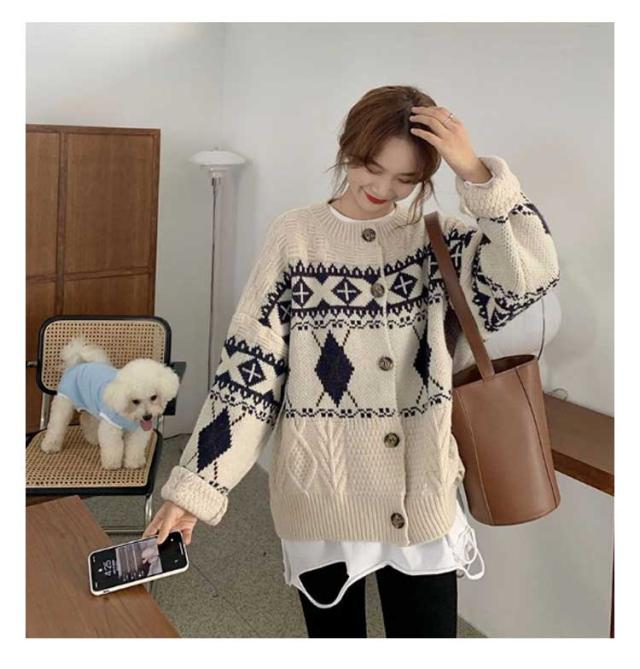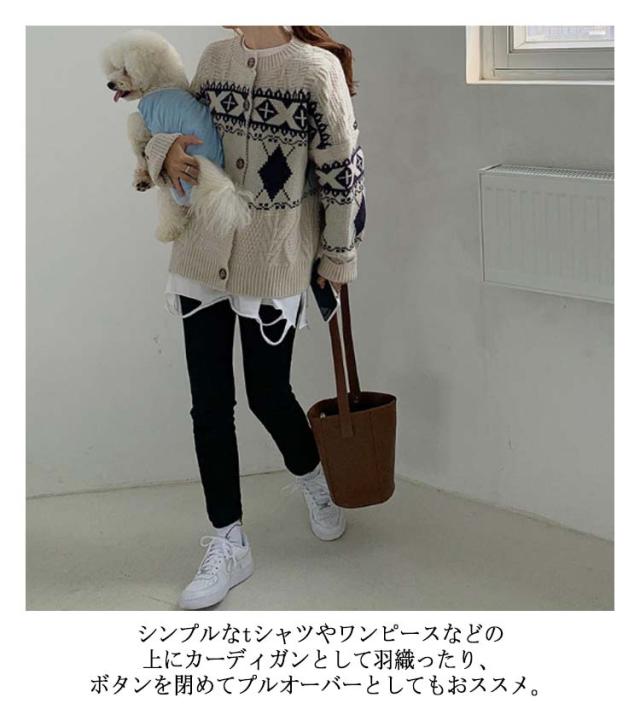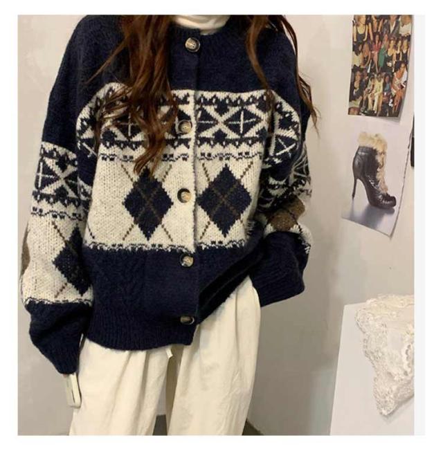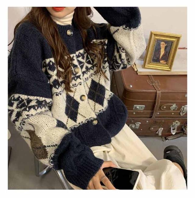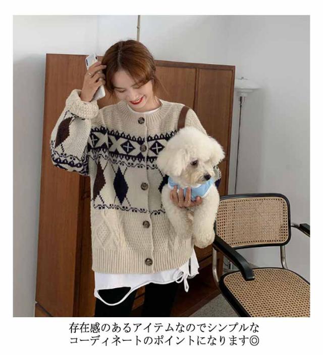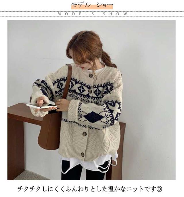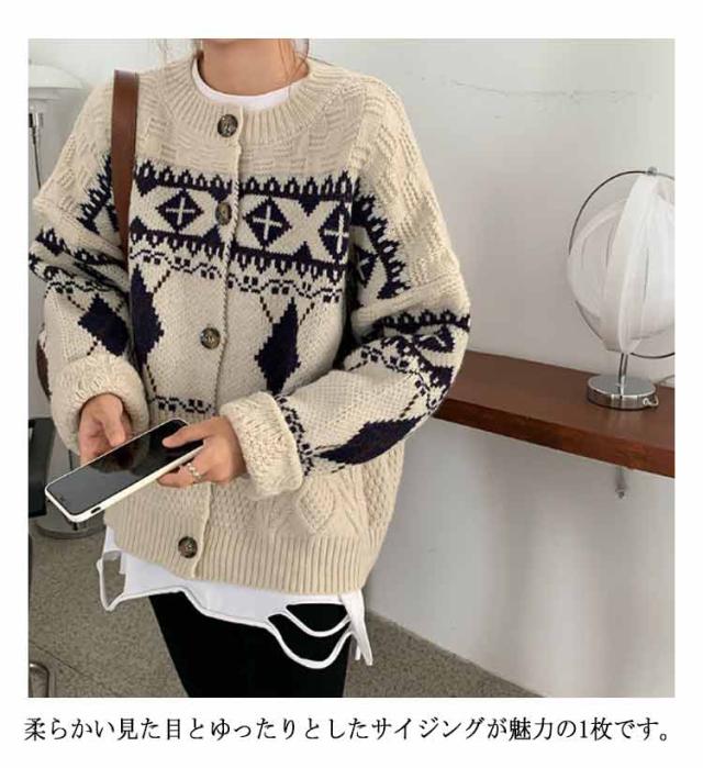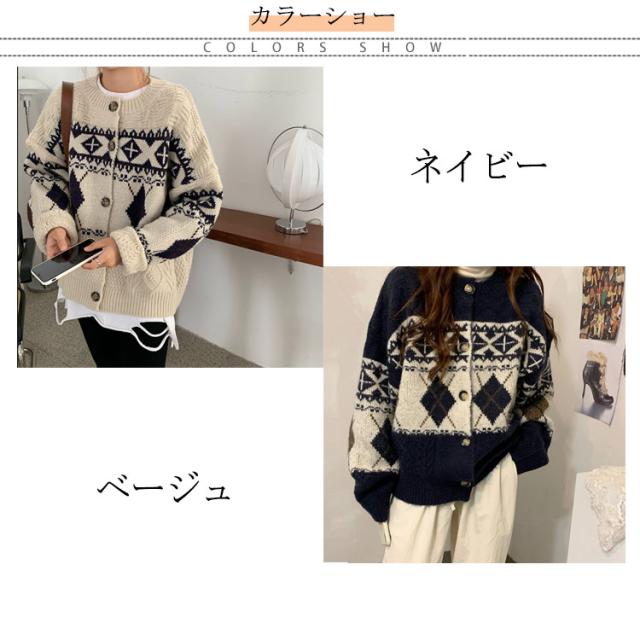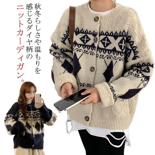 カーディガン ニット レディース ダイヤ柄 ノルディック柄 フェアアイル柄 ニット カーディガン 長袖 プルオーバー トップス セーター 秋冬 クルーネック ミドル丈 ニットカーディガン 羽織り 厚手 通勤 通学 大きいサイズ ゆったり レトロ 秋冬 秋服 冬服 送料無料