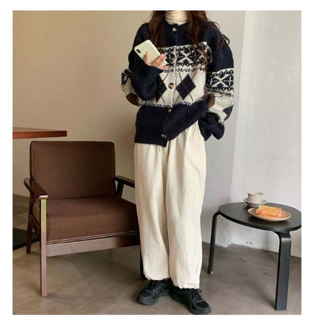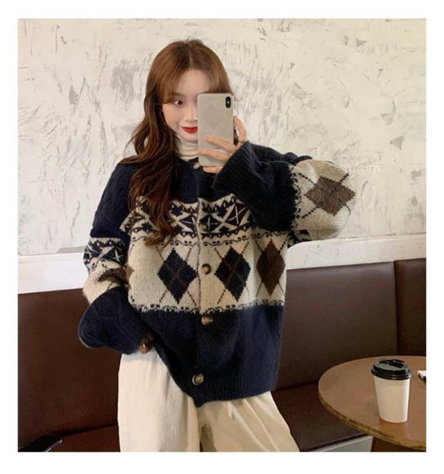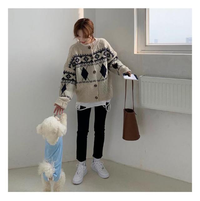 | 秋冬らしさや温もりを感じるダイヤ柄のニットカーディガン。 チクチクしにくくふんわりとした温かなニットです◎ 柔らかい見た目とゆったりとしたサイジングが魅力の1枚です。 存在感のあるアイテムなのでシンプルなコーディネートのポイントになります◎ シンプルなtシャツやワンピースなどの上にカーディガンとして羽織ったり、ボタンを閉めてプルオーバーとしてもおススメ。 | |