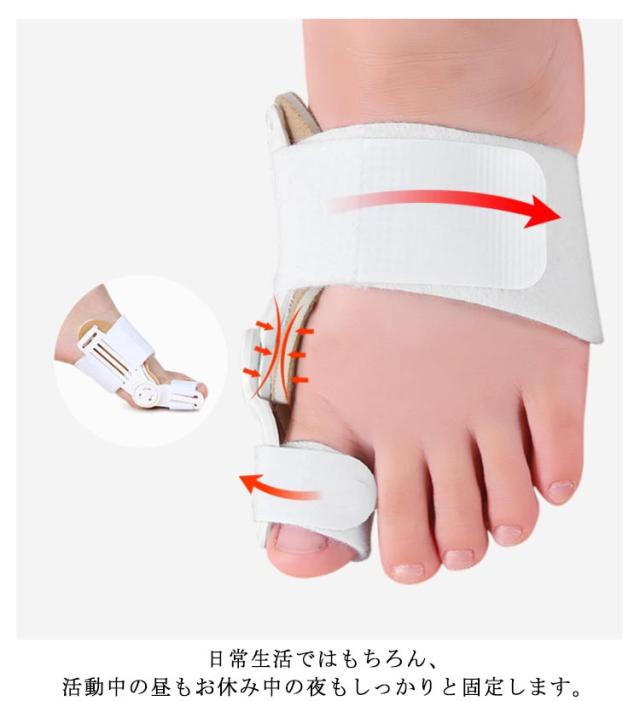 | 外反母趾変形を緩和するために3点圧力システム採用 日常生活ではもちろん、活動中の昼もお休み中の夜もしっかりと固定します。 痛みや疲れを軽減します 足指をやさしく保護する外反母趾専用サポーターで歩行時に痛みが伴う方 親指が曲がってきた方、親指の根元が靴にぶつかる方などにオススメです。 耐久性に優れ、長期間使用しても変形しません。 汚れたら水洗いできるので、繰り返し清潔にお使いいただけます。 | |