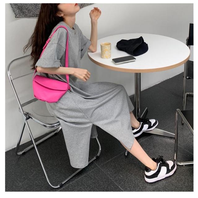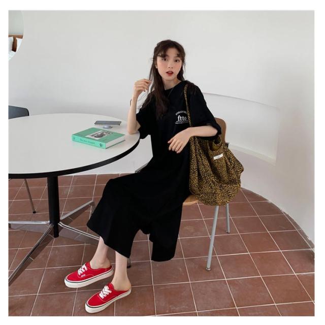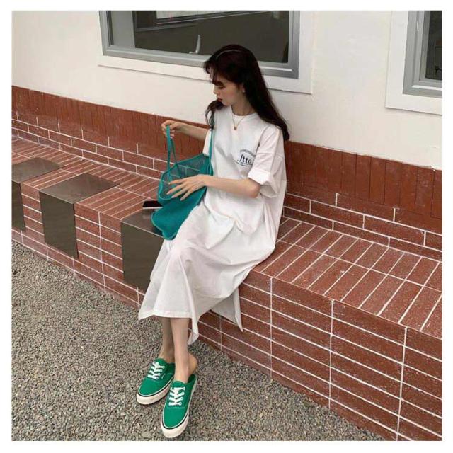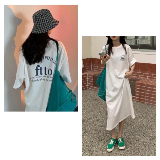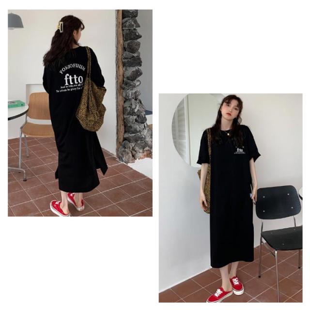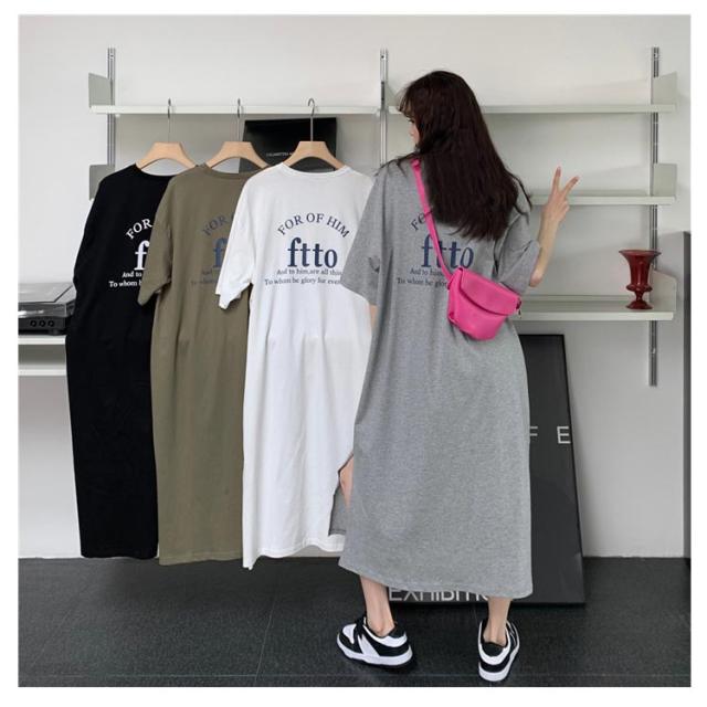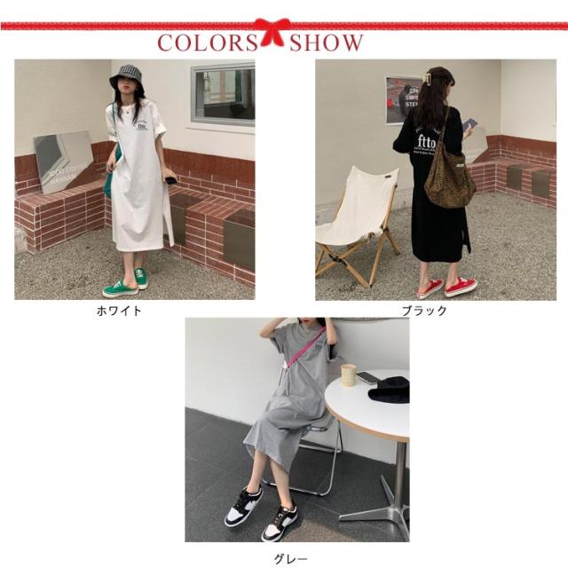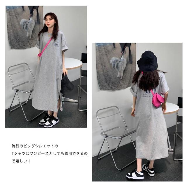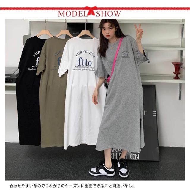 tシャツワンピース レディース ロング丈Tシャツ 半袖 Tシャツワンピース ロング ワンピース ラウンドネック 半袖 ワンピース ルームウエア 部屋着 ロングワンピース 英字プリント 可愛い スリット 韓国ファッション 送料無料
