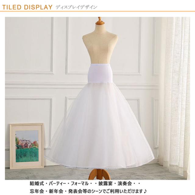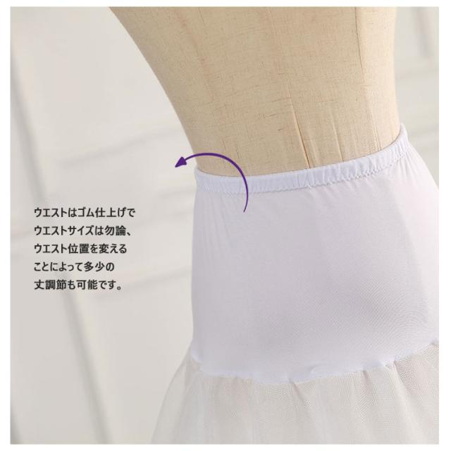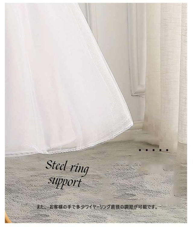| フォーマルシーン用のロングドレスや花嫁ドレスをより一層美しく見せるロングパニエ ウエストはゴム仕上げでウエストサイズは勿論、ウエスト位置を変えることによって多少の丈調節も可能です。 また、お客様の手で多少ワイヤーリング直径の調節が可能です。 スカートやドレスのラインをふわっとさせることで、ウエスト周りや上半身をほっそり見せてくれます。 結婚式・パーティー・フォーマル・・披露宴・演奏会・・忘年会・新年会・発表会等のシーンでご利用いただけます♪ | |