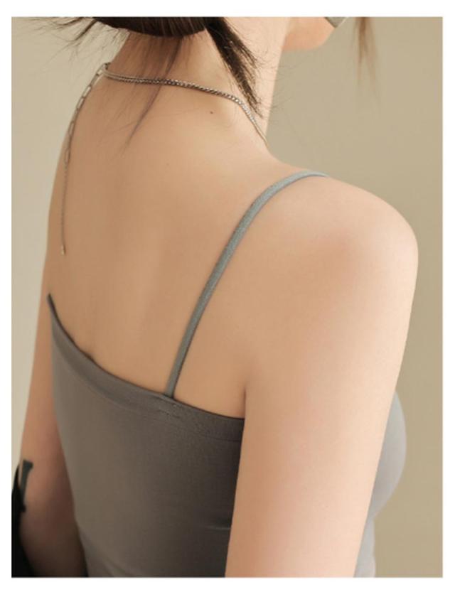 | 選べる5色! 【 カップ付きナローストラップキャミソール 】 華奢なストラップでヘルシーに魅せるカップ付きキャミソール。 華奢なストラップがトップスに響きにくいので タイトなトップスのインナーにも◎ 春夏に着る機会の増えるシアー系のインナーにピッタリなアイテムです! | |