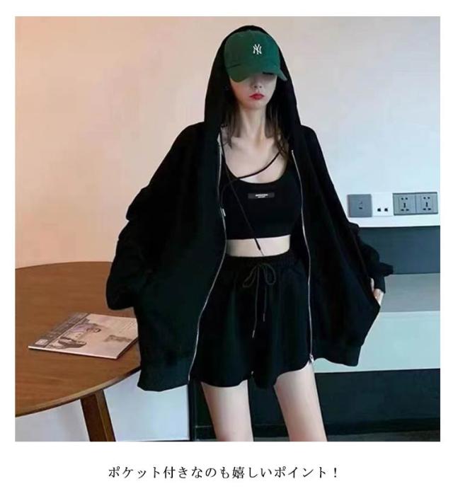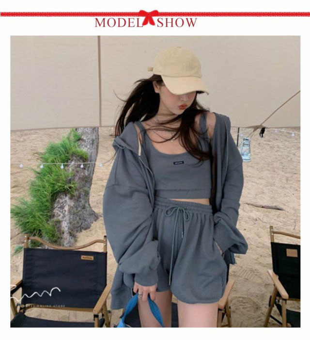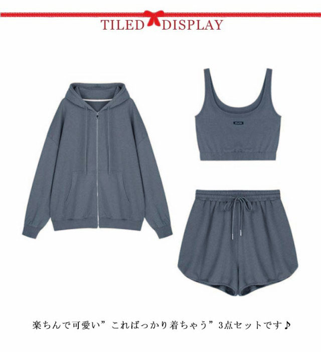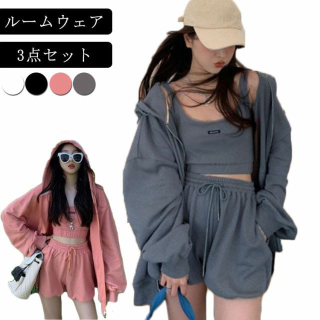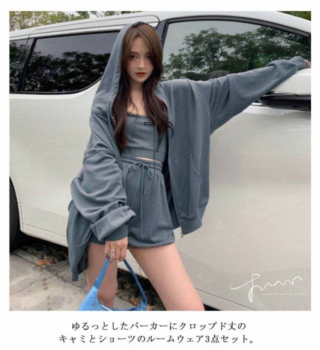 ルームウェア レディース セットアップ 上下セット パーカー キャミ ショーツ 3点セット 春 部屋着 ワンマイルウェア 可愛い お洒落 シンプル 無地 クロップド丈 スウェット ポケット付き 韓国 グレー 【 ルームウェア3点セット 】