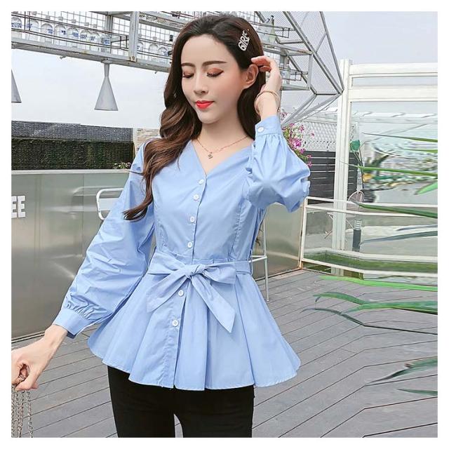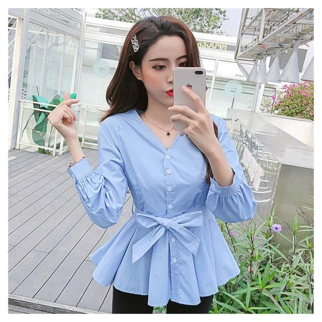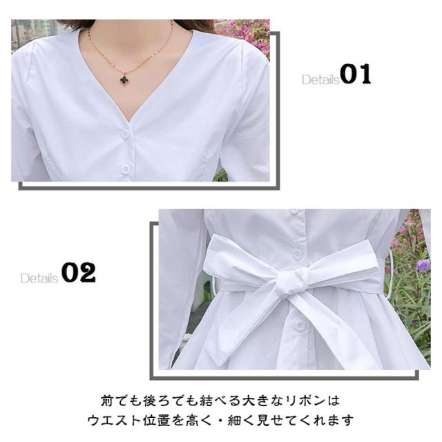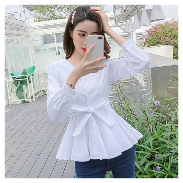 ウエストリボンベルト付きがアクセント!Vネックトップス レディース ブラウス シャツ トップス Vネック フリルブラウス 長袖 リボン Aライン フリル 無地 春 春服 秋 秋服 送料無料