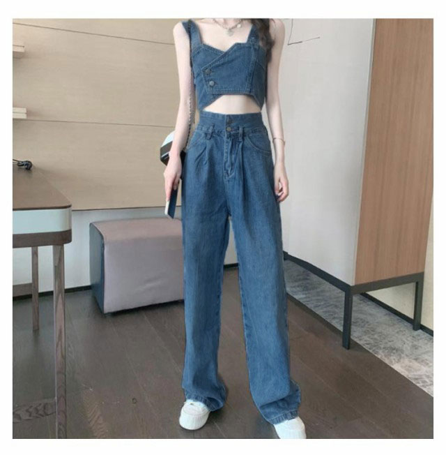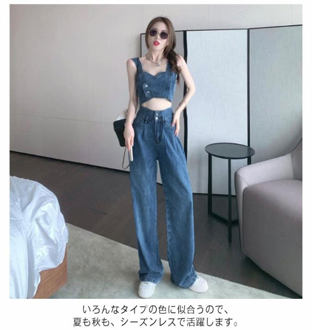 デニム セットアップ レディース ジーンズ デニムパンツ デニムタンクトップ タンクトップ ワイドパンツ ダンス衣装 ヒップホップ 可愛い へそ出し ステージ衣装 ジュニア ダンス ジージャン ジーンズ おしゃれ カジュアル 春 夏 春夏 送料無料