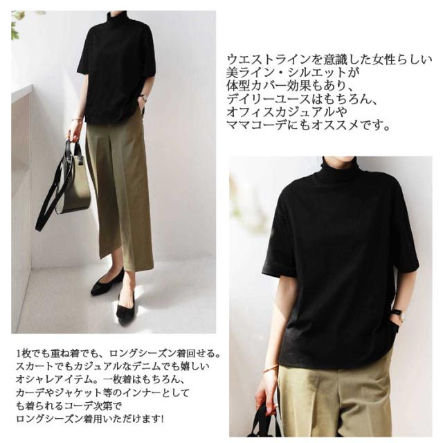 | 肌触りの良いコットン100%素材。サラッとした肌ざわりで、ロングシーズン大活躍間違いなしの半袖Tシャツです。ハイネックデザインで、首もとをおしゃれに隠せる! 飽きのこないシンプルなデザインで1枚は持っておきたい万能アイテム! ウエストラインを意識した女性らしい美ライン・シルエットが体型カバー効果もあり、デイリーユースはもちろん、オフィスカジュアルやママコーデにもオススメです。 ほんのり立ち上がったハイネックでクラシカルな印象にやさしいフィット感で女性らしい美シルエットを演出!通気性が良く、肌ざわりも良い、伸縮性のある素材で、着心地よく清潔感のあるカットソーなので、シーズンやシーン、テイストを問わない着回し力抜群のファッション・アイテムです。 シンプルなシルエットはそのまま着てのお出掛けはもちろん、上から1枚羽織ればオフィスにもちょっとしたおでかけにも使えます。生地は暑い季節は快適に、寒い季節は重ね着してもごわつかず重宝しますので、季節をまたいで1年中オールシーズン着られる優秀なアイテムです。 1枚でも重ね着でも、ロングシーズン着回せる。スカートでもカジュアルなデニムでも嬉しいオシャレアイテム。一枚着はもちろん、カーデやジャケット等のインナーとしても着られるコーデ次第でロングシーズン着用いただけます! | |