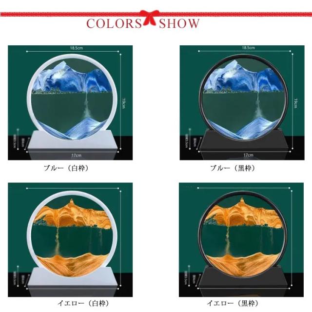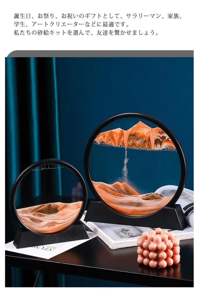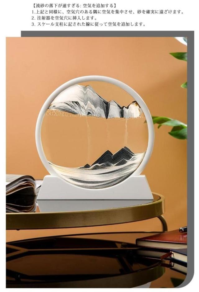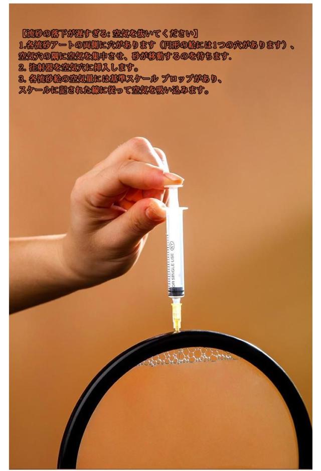 | 3D砂絵流れ砂時計。砂の静かな流れに癒される絵画のようなインテリア。 注射器付き・砂絵のdiy!必要に応じて砂の落下速度を調節したり、日常のメンテナンスに使用したりできます。サンドピクチャーを上下または左右に振ると、小さな泡が砂の落下速度を適度に制御し、独自の砂の芸術の風景を作成し、プロセスを楽しみ、同時に、実践的な能力を開発します。 フレームを上下逆さまにすると色の異なる砂が空気の膜の間を通って下にゆっくりと落ちていきます。 同じ絵は出来ることがなく、一期一会の情景をお楽しみ頂けます。 グラデーションの砂はどんなインテリアにも馴染み易く、置きやすいのも嬉しいポイントです。 忙しい日々の中に、一日の終わりに、ただ砂を眺めるゆったりとした時間を さりげなくお部屋を彩るサンドピクチャーは、新築祝い、引っ越し祝いのギフトにもおすすめです。 誕生日、お祭り、お祝いのギフトとして、サラリーマン、家族、学生、アートクリエーターなどに最適です。私たちの砂絵キットを選んで、友達を驚かせましょう。 大きな水ぶくれができたら、上下に振ってたくさんの小さな泡に変えてください。 小気泡数の目安:0.5-2cm幅です。 小さな泡の目的は砂をブロックすることで、ゲストは左右に傾けることで小さな泡の位置を調整し、砂が落ちる位置と速度を調整できます。 ※気温や気圧の変化に伴い、流砂塗装内の空気や水を調整する必要がある場合があります。 流砂塗装パッケージにはシリンジがあり、各流砂塗装の両側または片側に空気水分調整穴があります。このように、実際の状況に応じて自分でメンテナンスできます。 【流砂の落下が遅すぎる: 空気を抜いてください】 1.各流砂アートの両側に穴があります(円形の絵には1つの穴があります)、空気穴の隅に空気を集中させ、砂が移動するのを待ちます. 2. 注射器を空気穴に挿入します。 3. 各流砂絵の空気量には基準スケール プロップがあり、スケールに記された線に従って空気を吸い込みます。 【流砂の落下が速すぎる: 空気を追加する】 1.上記と同様に、空気穴のある隅に空気を集中させ、砂を確実に遠ざけます。 2. 注射器を空気穴に挿入します。 3. スケール支柱に記された線に従って空気を追加します。 【流砂絵付け中の小さな気泡が多く、特に大きな気泡になった場合は、少量の水を入れて水分の蒸発を | |