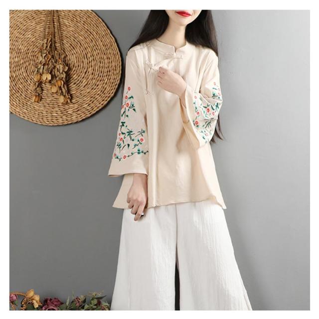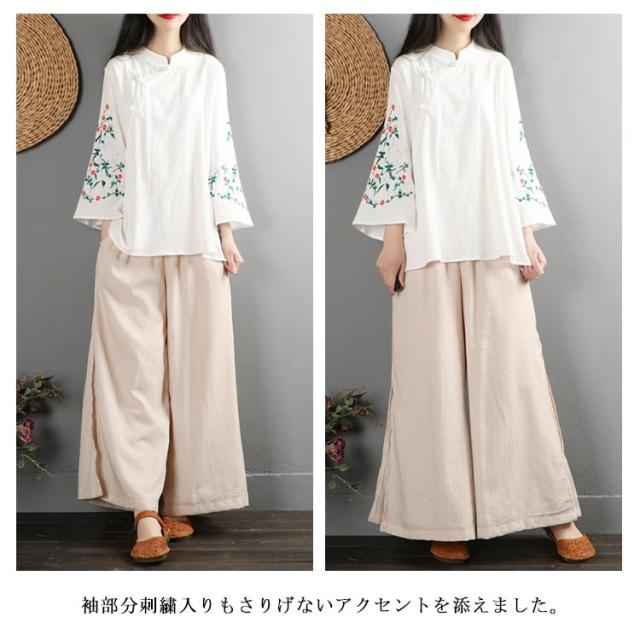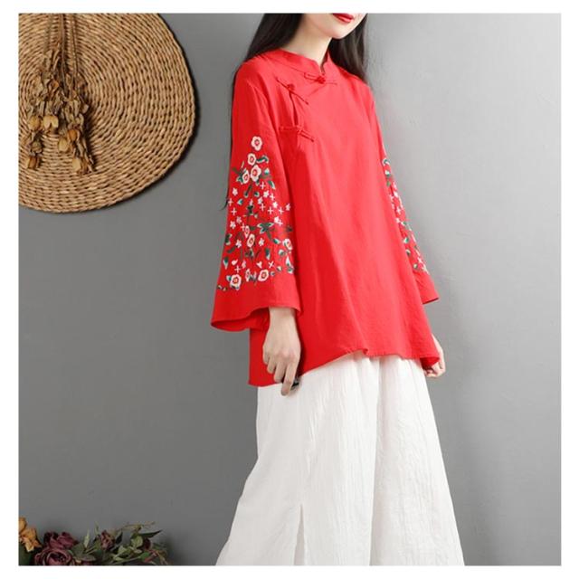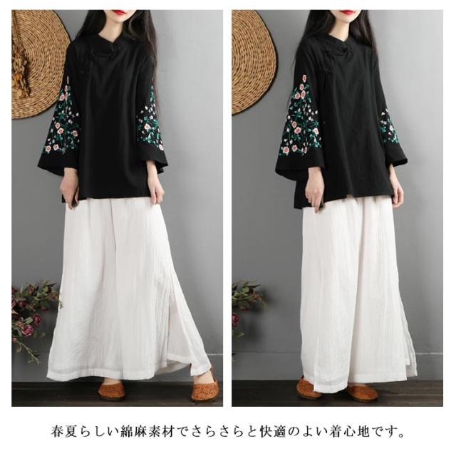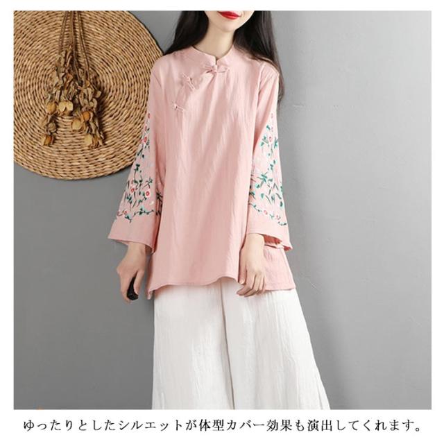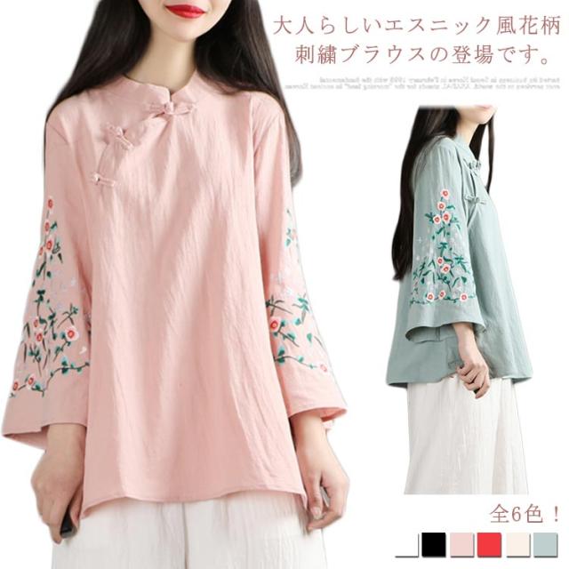 全6色!花柄刺繍ブラウス フレアスリーブ 刺繍トップス チャイナボタン ブラウス 綿麻 長袖 花柄 刺繍 カジュアル レイヤード ゆったり 春服 春物