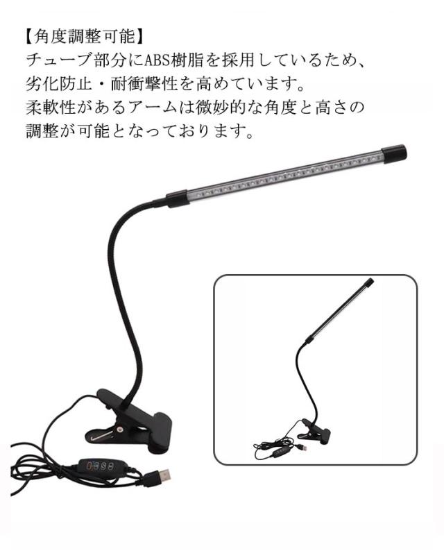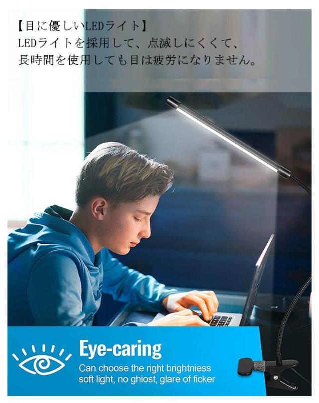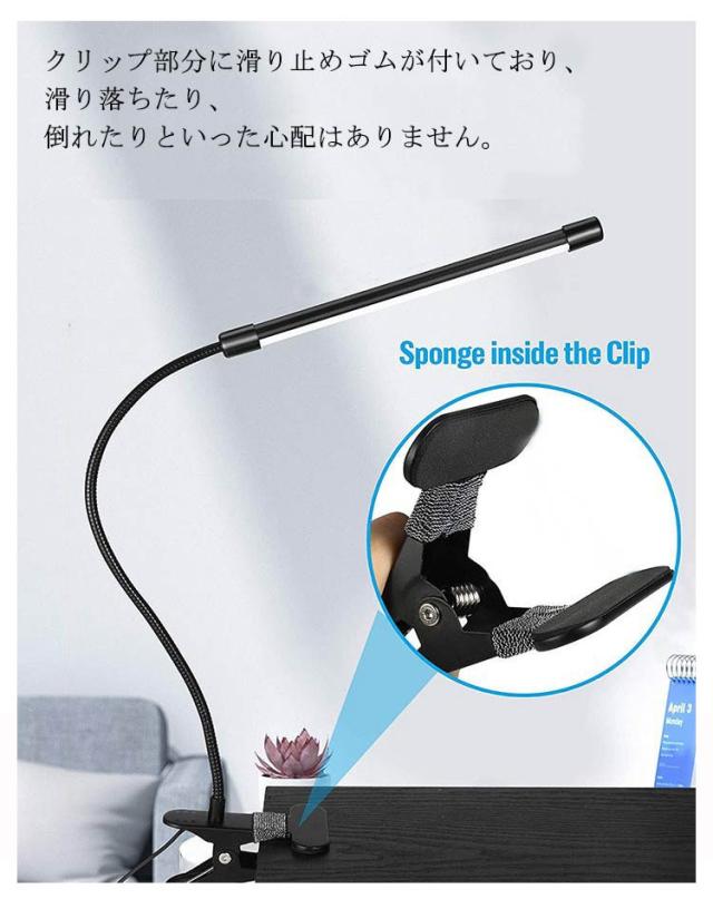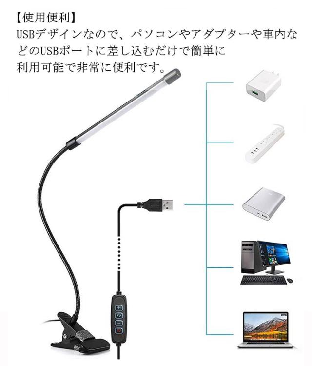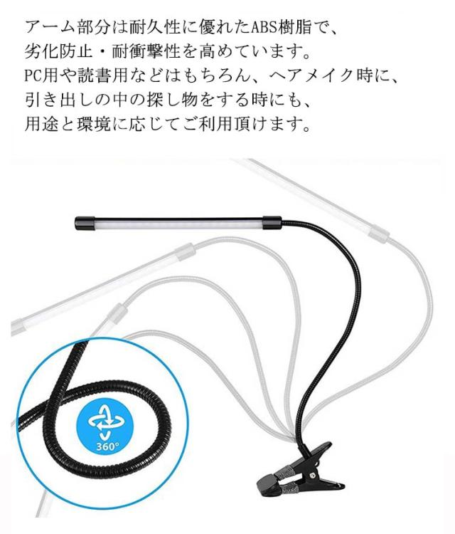 | 【クリップ式&スタンド式】大型クリップ式のため、ベッドやデスクに取り付け可能です。クリップ自体もスタンドなので、自立式スタンドとしてもお使い頂けます。クリップ部分に滑り止めゴムが付いており、滑り落ちたり、倒れたりといった心配はありません。 【調光調色可能】スイッチ搭載なので、3段階調色と調光を調節できます。お好みの色を選べるようになっております。 【目に優しいLEDライト】LEDライトを採用して、点滅しにくくて、長時間を使用しても目は疲労になりません。 【角度調整可能】チューブ部分にABS樹脂を採用しているため、劣化防止・耐衝撃性を高めています。柔軟性があるアームは微妙的な角度と高さの調整が可能となっております。アーム部分は耐久性に優れたABS樹脂で、劣化防止・耐衝撃性を高めています。PC用や読書用などはもちろん、ヘアメイク時に、引き出しの中の探し物をする時にも、用途と環境に応じてご利用頂けます。 【使用便利】USBデザインなので、パソコンやアダプターや車内などのUSBポートに差し込むだけで簡単に利用可能で非常に便利です。勉強や仕事には最適な照明グッズです。色々な場合にも大活躍られます。 | |
