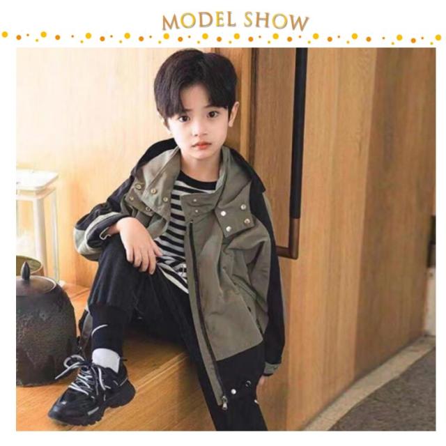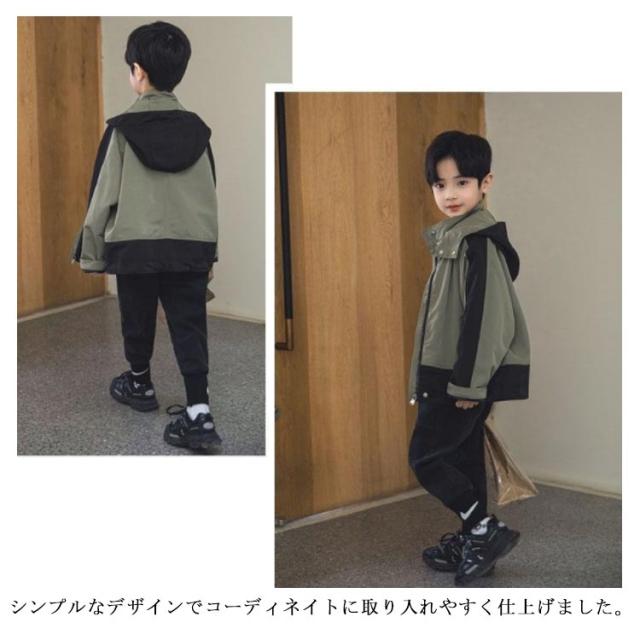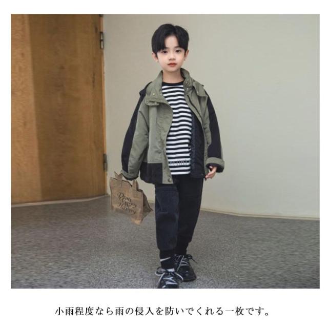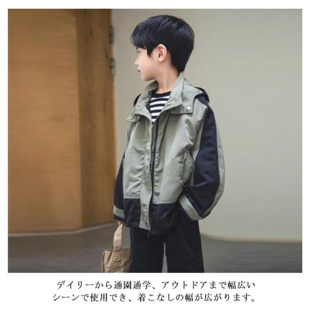 マウンテンパーカー キッズ 男の子 秋 アウター ジャケット 子供服 小学生 ウインドブレーカー フード付き 薄手 防風 撥水 上着 裏地付き 春 無地 配色 通学 登校 普段着 110 120 130 140 150 160 カーキ おしゃれ【送料無料】