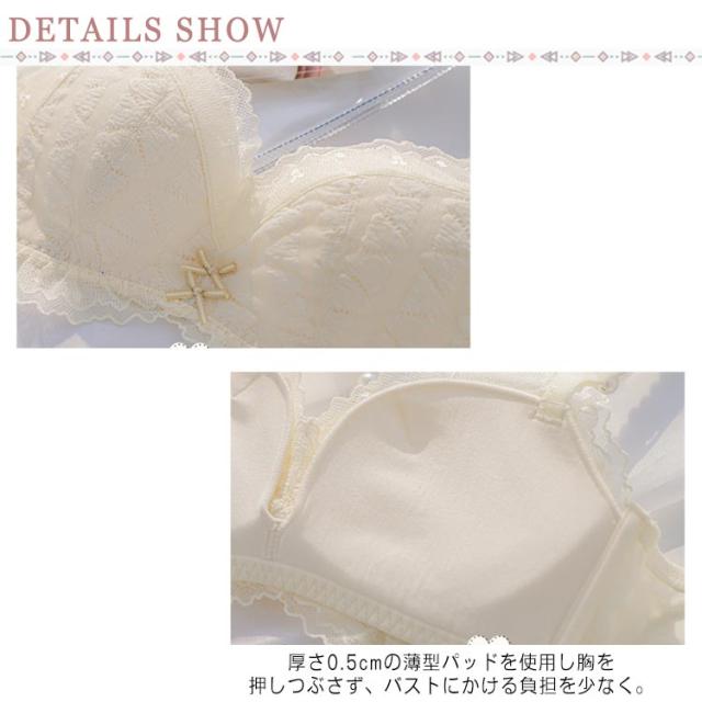| 美しく快適な薄手の育乳ブラジャーです。 脇のお肉をしっかりとキャッチして逃がさず、自胸で谷間を作ります。 厚さ0.5cmの薄型パッドを使用し胸を押しつぶさず、バストにかける負担を少なく。 胸に当たる裏の部分の生地は肌に優しいシルクを含め、健康的で通気性のあるバストケアを実現。 ノンワイヤーで締め付け感なくて着心地がよいです。 美しいバストラインを寝ている間に美胸を作る締付け感なし。 | |