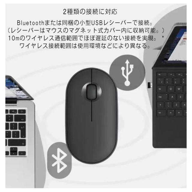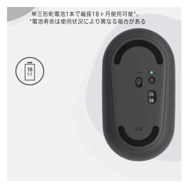 | モダン、スリム、美しい薄型形状 デスクトップのアクセントになる、モダン&スリムなデザイン。空間を自分仕様にカスタマイズ。 持ち運びやすい スリムな形状で、ノートパソコンと一緒に持ち運び、カフェや外出先でスマートに作業可能。 静かな場所でもクリック音が気にならない静音設計 カチカチというクリック音を気にすることなく静かなカフェや図書館、寝室などで使えます。 人間工学に基づいたデザイン カーブや手触りは手に吸い付くようですべての使用感が軽く、薄型な本体は持ち運びもラクラク。 2種類の接続に対応 Bluetoothまたは同梱の小型USBレシーバーで接続。(レシーバーはマウスのマグネット式カバー内に収納可能。)10mのワイヤレス通信範囲でほぼ遅延のない接続を実現。 *ワイヤレス接続範囲は使用環境などにより異なる。 長電池寿命 単三形乾電池1本で最長18ヶ月使用可能*。 *電池寿命は使用状況により異なる場合がある | |