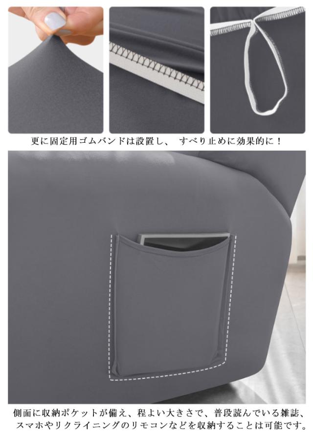 | 防水素材を使用、柔らかさと弾力性が優れている素材で、 ソファーをしっかり包み込んで、いくら動いても 変形しにくいです。 側面に収納ポケットが備え、程よい大きさで、普段読んでいる雑誌、 スマホやリクライニングのリモコンなどを収納することは可能です。 手洗いはもちろん、洗濯機にも対応可能です。 お手入れ簡単でいつでも清潔に! カバー本体はゴム仕様で、ソファーにしっかり固定します。 更に固定用ゴムバンドは設置し、 すべり止めに効果的に! | |