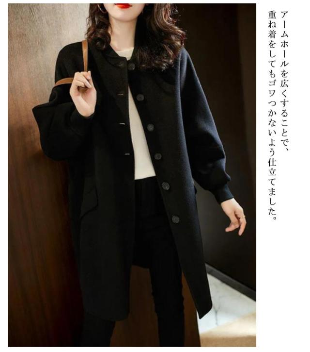 ノーカラーコート ロングコート ニットメルトン レディース 春秋冬 ロング 無地 ミドル丈 膝上 ボリューム袖 韓国風 秋アウター 春アウター ゆったり クルーネック ボリュームスリーブ 袖リブ おしゃれ きれいめ ゆったり 羽織る 黒コート 20代 30代 40代 50代