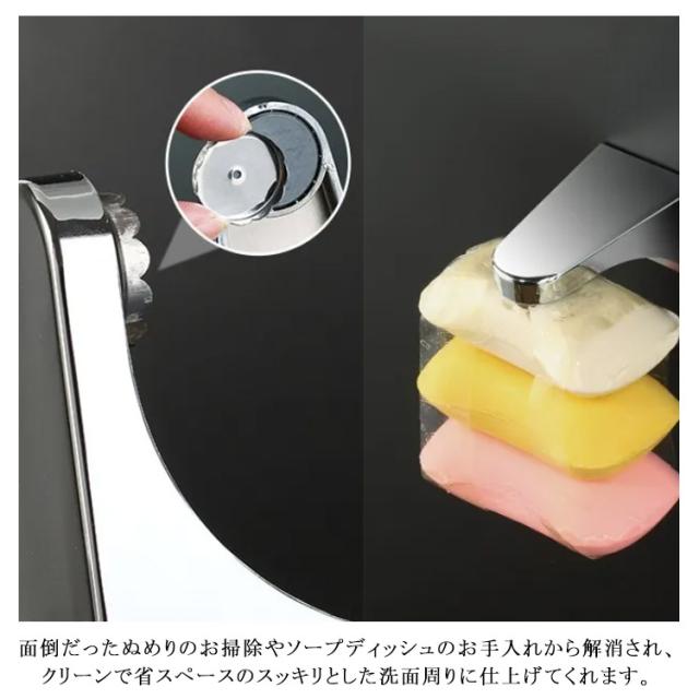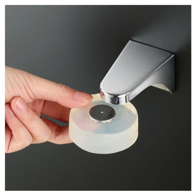 | 石鹸を浮かせて収納するマグネット式の石鹸用ホルダーです。 固形石鹸にホルダーをセットし、磁力でキャッチして固定出来る優れモノ。 石鹸を宙に浮かせて収納するから水はけが良く、石けんが乾きやすく、長持ちします。 面倒だったぬめりのお掃除やソープディッシュのお手入れから解消され、クリーンで省スペースのスッキリとした洗面周りに仕上げてくれます。 洗面所や浴室にピッタリのおしゃれで機能的な石鹸置きです。 取付方法 1. 土台の剥離紙をめくり、壁に付けます。壁面はあらかじめよく拭き、汚れや水分の無い状態で付けてください。 2. 土台の先には石鹸をホールドしておくための強力なマグネットがついています。王冠状のホルダーのギザギザした面を、石鹸に強く押し込み、土台のマグネットで石鹸ごとホルダーをキャッチして設置完了です。 | |