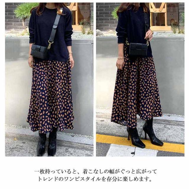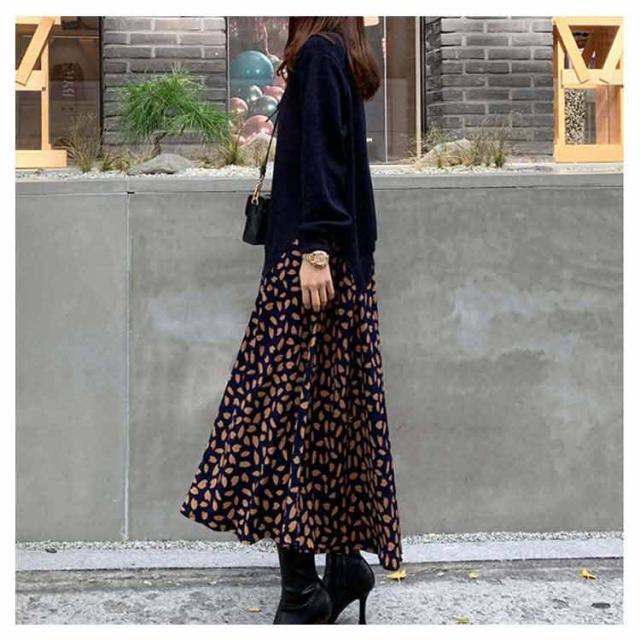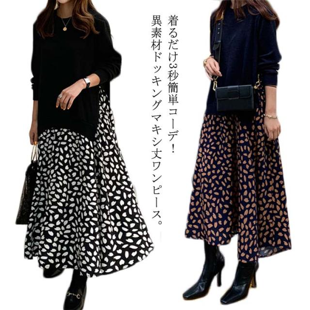 ドッキングワンピース ロングワンピース ニットワンピース 異素材 ドッキング 花柄 ドット柄 切り替え ニット シフォン ワンピース マキシ丈 長袖 レディース 体型カバー ゆったり 柄物 韓国ファッション フェイクレイヤード 送料無料