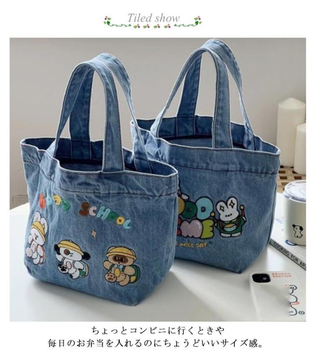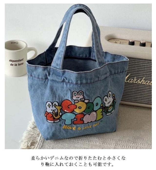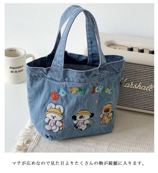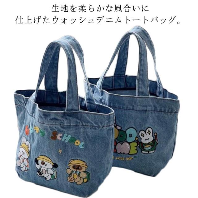 デニム トートバッグ サブバッグ ミニトート 刺繍入り クマ ウサギ デニム ウォッシュトート ランチバッグ お弁当 エコバッグ 小さめ 送料無料 サブバッグ コンパクト お弁当バッグ 手提げ マチ付き 雑貨 ナチュラル オシャレ かわいい