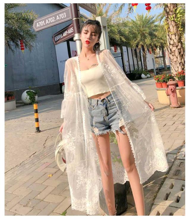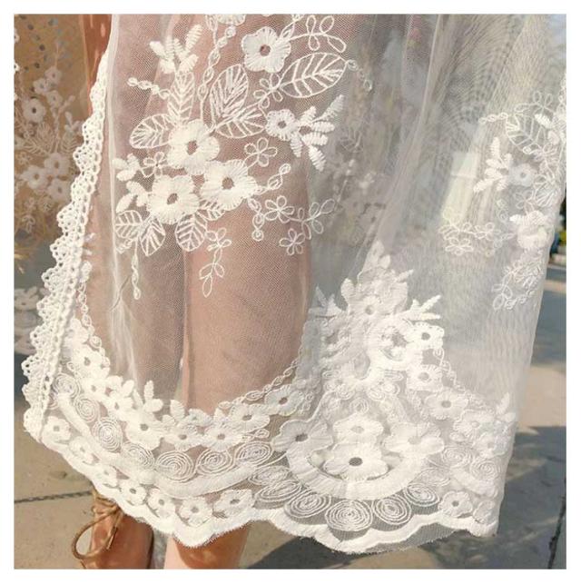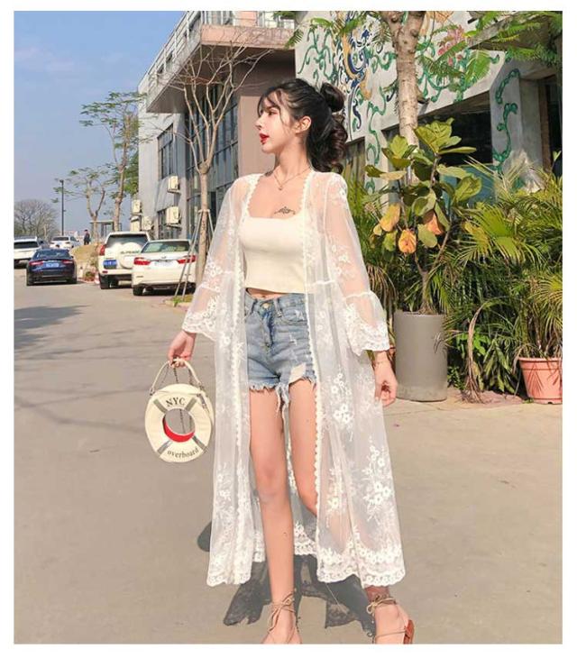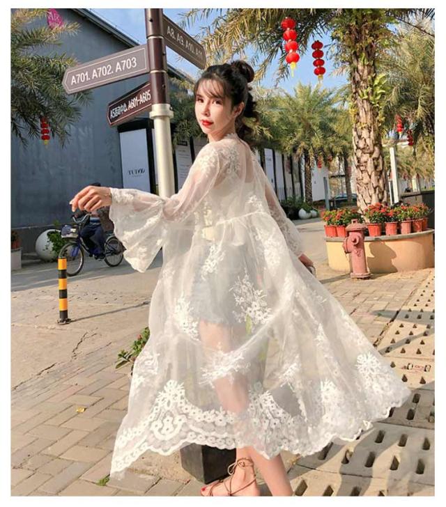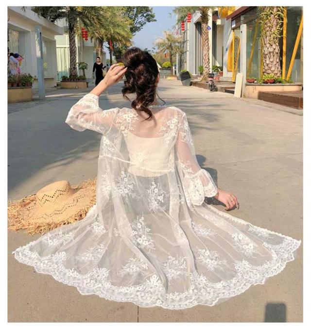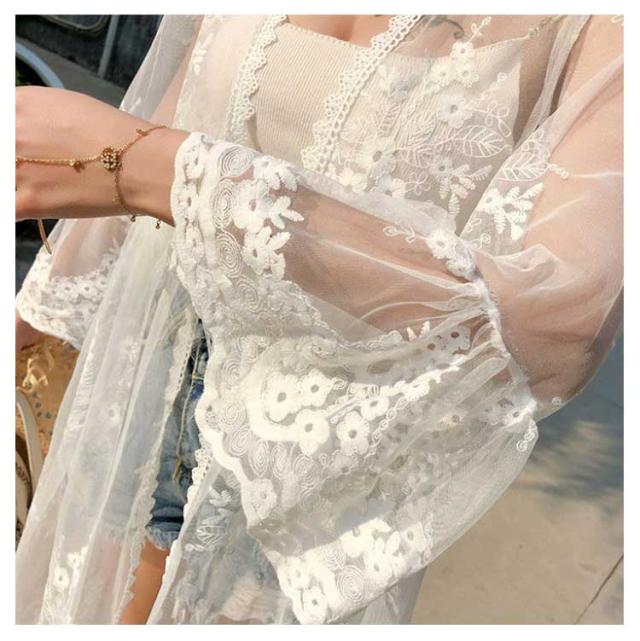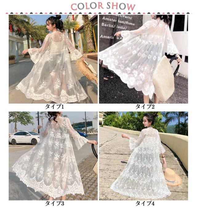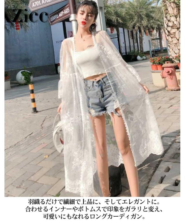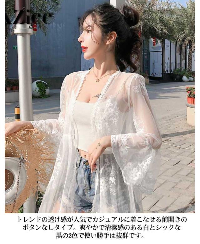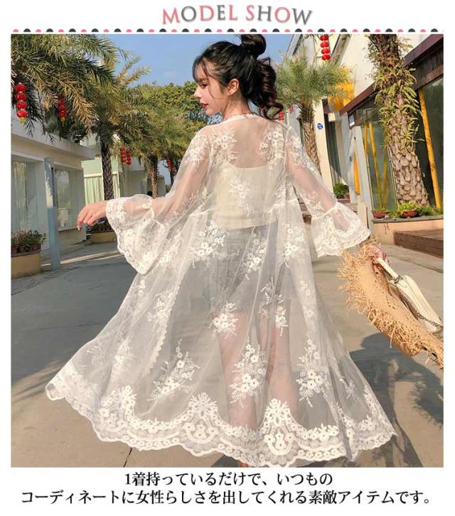 カーディガン レディース ロング ふんわり 七分袖 上品 花柄 刺繍 羽織 総レース デート お呼ばれ 春 夏 サマー 薄手 透け感 シースルー 体型カバー ゆったり ノーカラー エアリー フェミニン UVカット 紫外線対策 海 旅行 清楚 ホワイト 送料無料