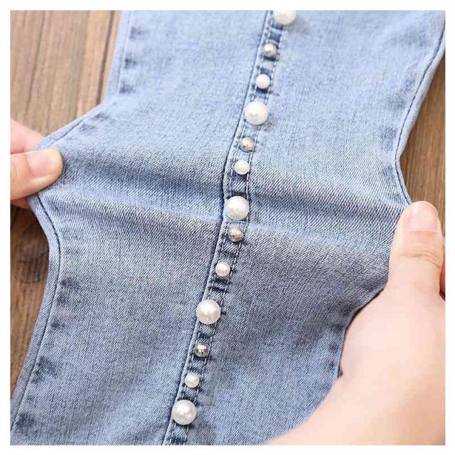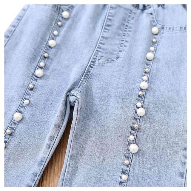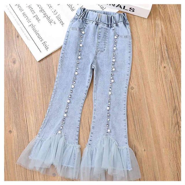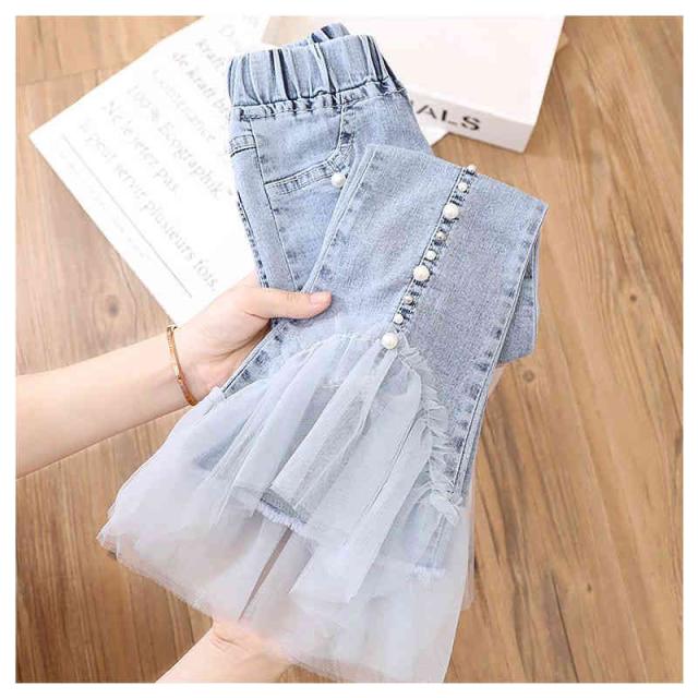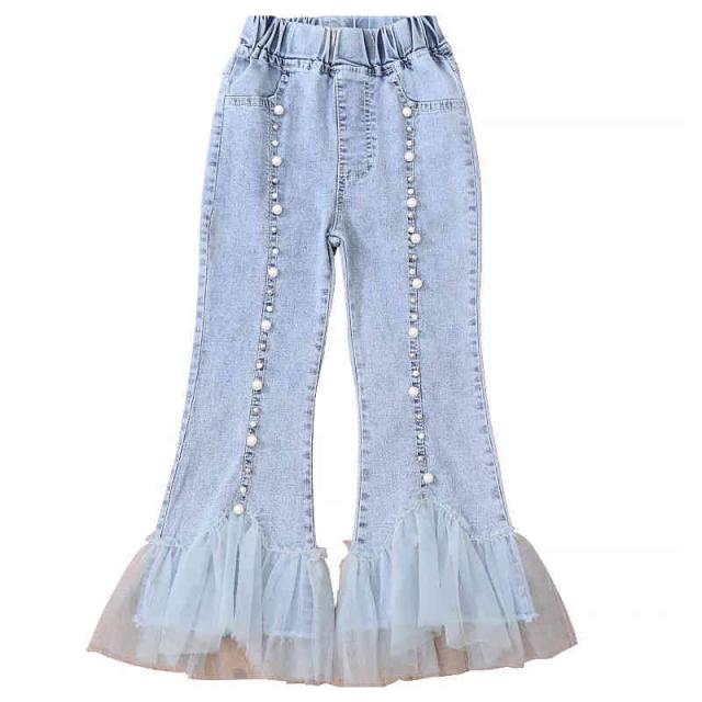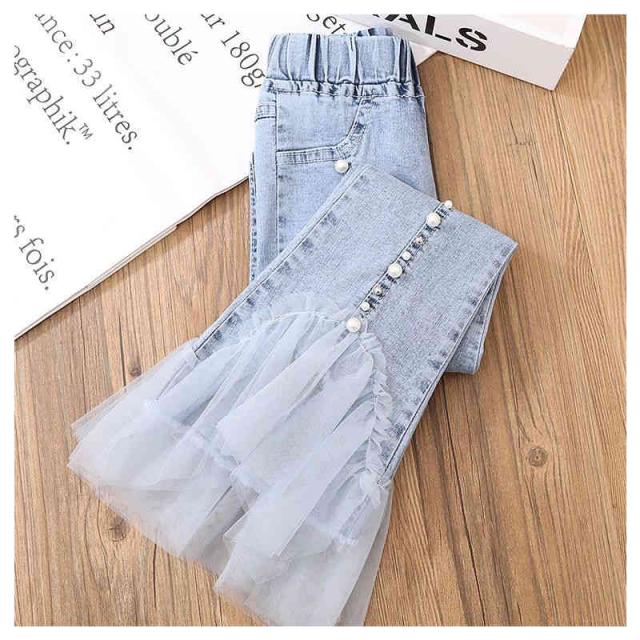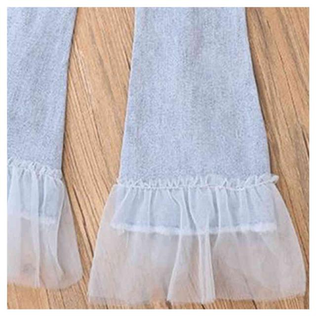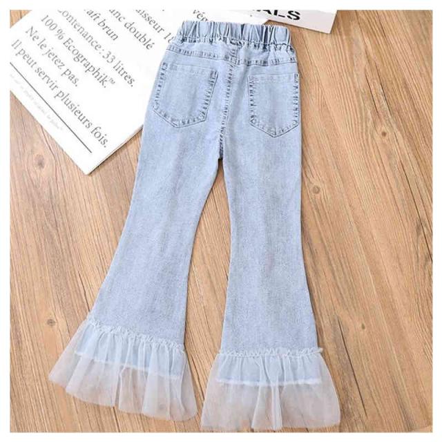 デニムパンツ キッズ 春 夏 女の子 春 秋 九分丈 チュールパンツ フレアパンツ ロングパンツ デニム レースパンツ ウエストゴム 子供服 ジュニア 無地 シンプル カジュアル おしゃれ おでかけ 送料無料