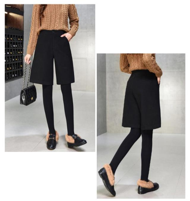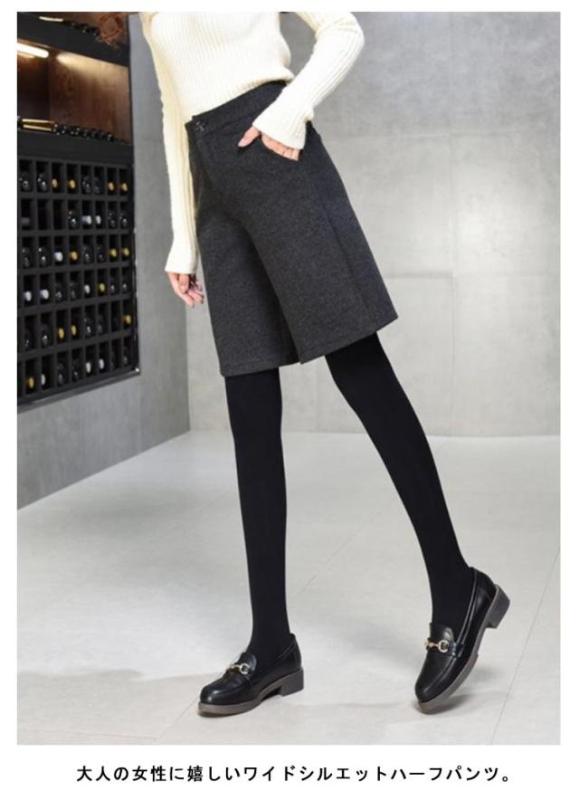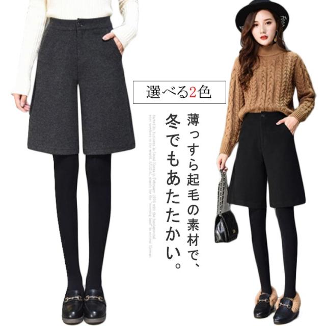 ショートパンツ 秋冬 膝丈パンツ 起毛感 Aライン 五分丈 ハーフパンツ キュロットパンツ 短パン キレイめ カジュアル ゆったり ハイウエスト 着痩せ ブラック チャコール
