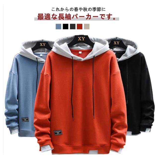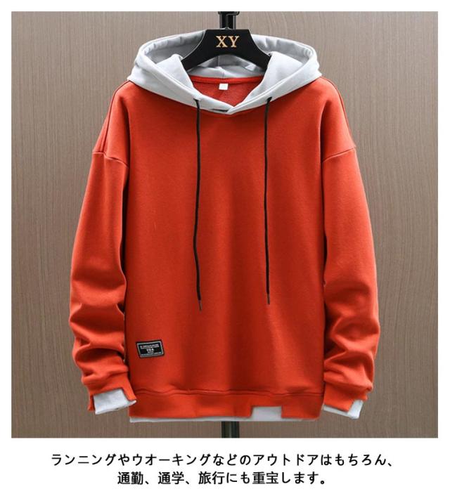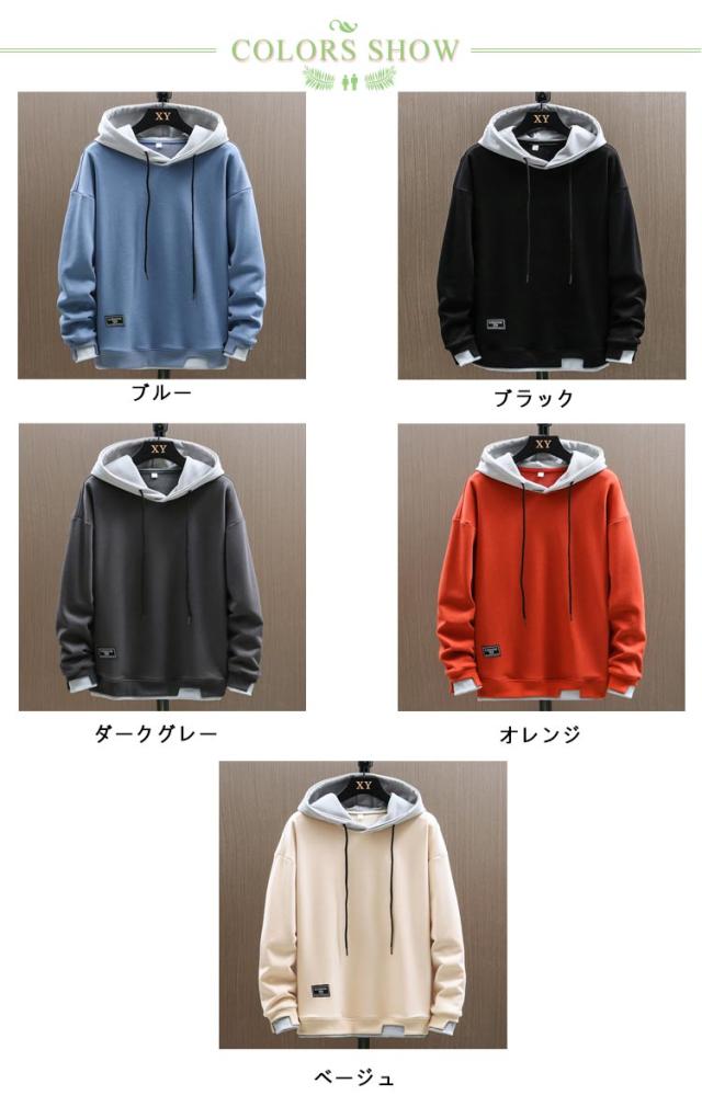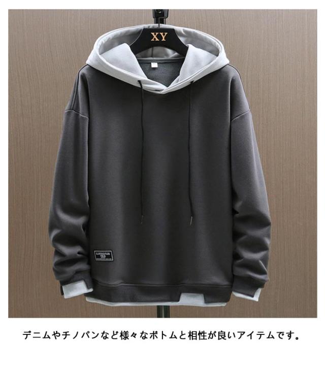 プルオーバー パーカー メンズ 長袖 フード付き トレーナー スウェット 重ね着風 無地 トップス シンプル カジュアル 大きめ 春秋冬 柔らかい シンプル 部屋着 ルームウェア スポーツウェア おしゃれ 大きいサイズ