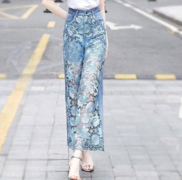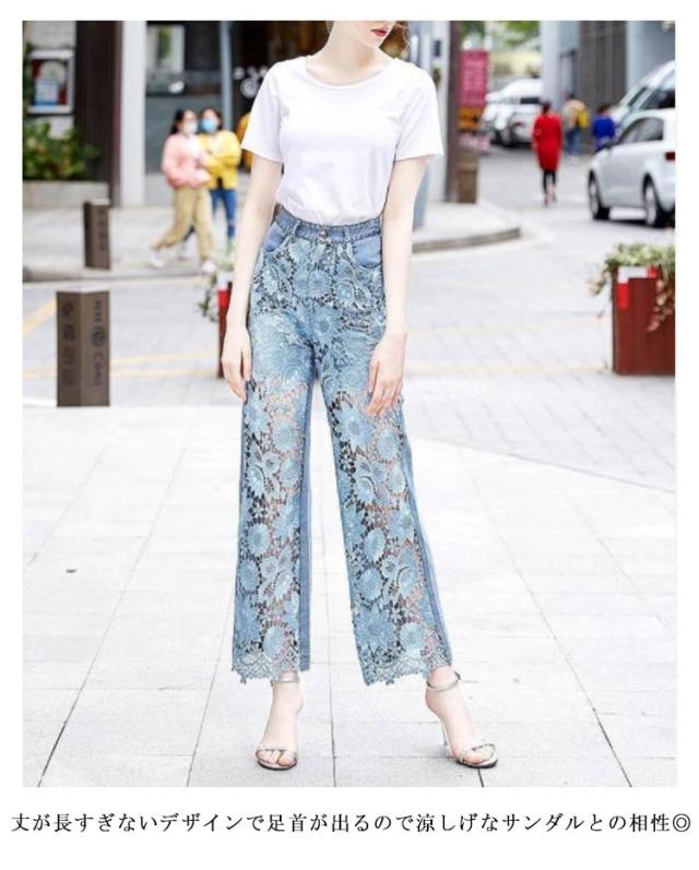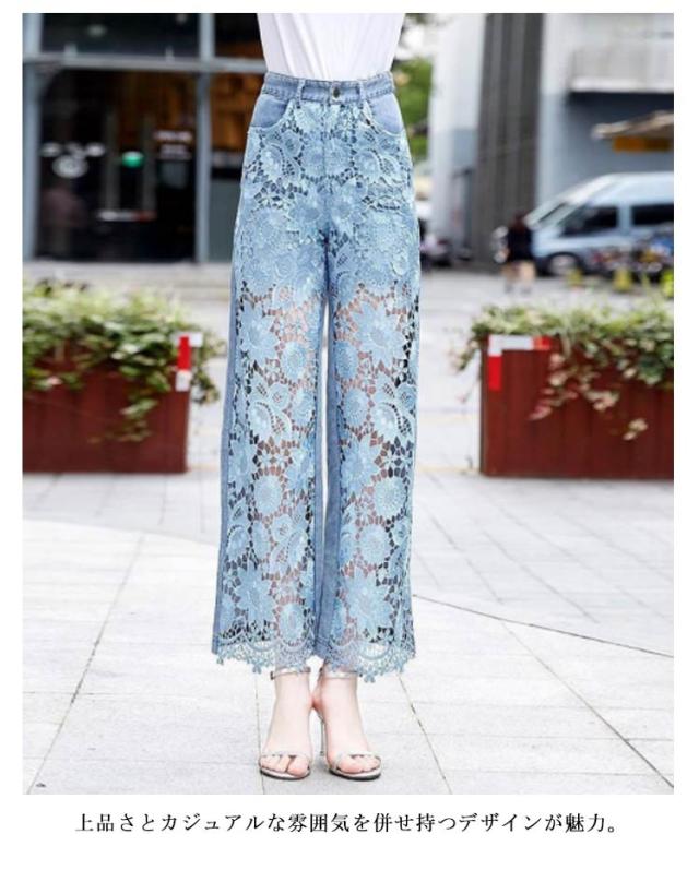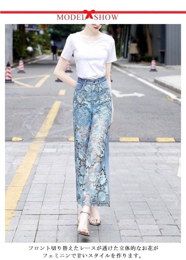 デニム ワイドパンツ レース 刺? ロング丈 レディース デニムパンツ 春 夏 花柄 レース 切り替え 肌見せ 透け感 ロングパンツ ボトムス 美脚 ゆったり 30代 40代 50代 大人 きれいめ かわいい ジーンズ ジーパン ストレートパンツ 【送無】