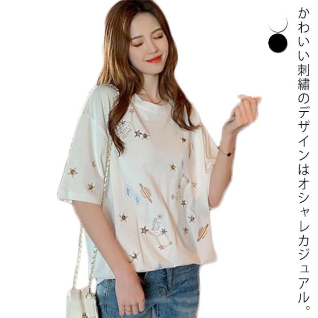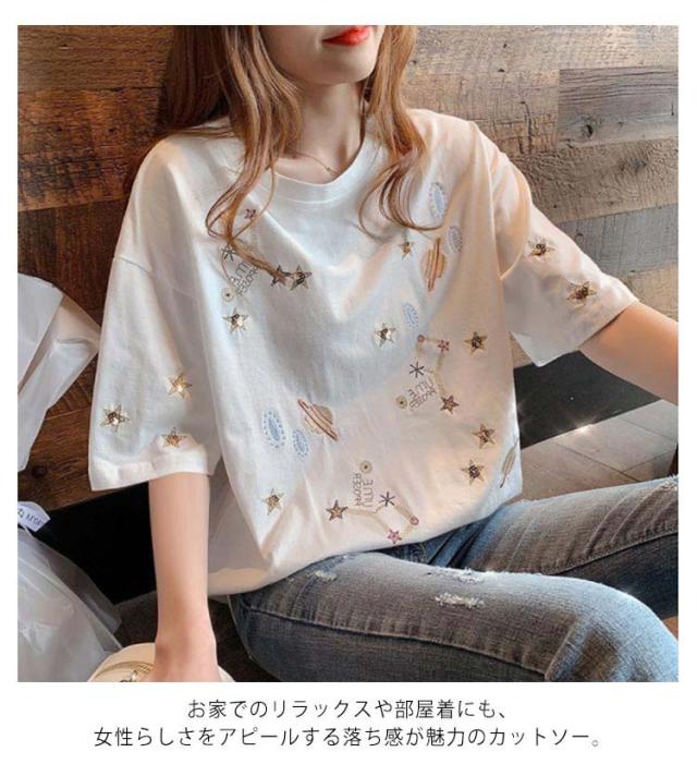 送料無料 Tシャツ 半袖 綿100% レディース トップス カットソー プルオーバー 丸首 コットンTシャツ スパンコール 刺? 宇宙柄 おしゃれ かわいい ゆったり M L XL 2XL