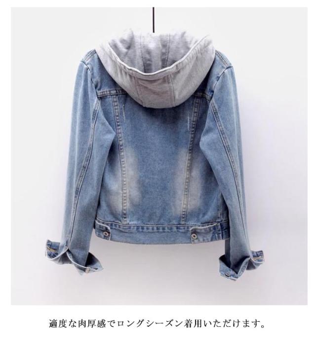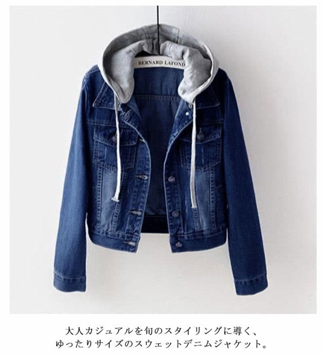 Gジャン レディース フード デニム ジャケット 大人 スウェットデニム ショート丈 フード付き ブルー インディゴブルー ゆったり 羽織 かわいい ファッション デニムジャケット 20代 30代 40代 大きいサイズ 春 秋 ポケット付き シンプル カジュアル アウター スエット