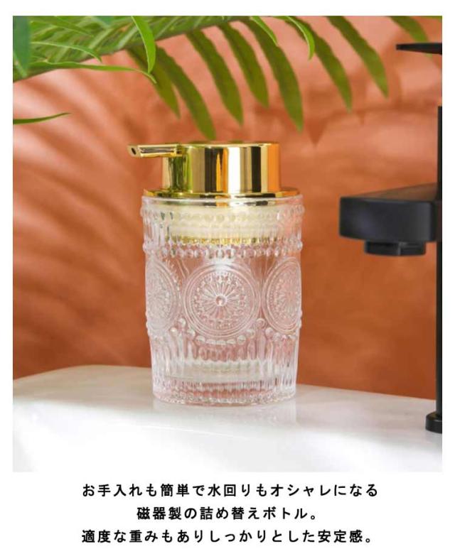 | ハンドソープなどの市販ボトルから、エンボスのディスペンサーに詰め替えるだけ! キッチンやバスルームがホテルのようなかっこいい空間に変身するインテリア小物です。 人気の北欧風や韓国インテリア、シャビーシックやモロッカン、バリ風などのアジアンリゾート系などさまざまなテイストのお部屋に似合います。 片手でプッシュしてそのまま手のひらで液体ソープを受け止められるので簡単に手洗いできます。 泡たてタイプも用意しています! ボディーシャンプー、手洗い用のリキッド石鹸など、さまざまな液状洗剤にご利用いただけます。 台所ならリキッドソープと食器用洗剤、洗面所では薬用せっけんを個人ごとに色別にして使い分けも可能です。 お手入れも簡単で水回りもオシャレになる磁器製の詰め替えボトル。 適度な重みもありしっかりとした安定感。 北欧風の空間の演出に、ディスペンサーひとつで、上質な洗面スペースを造れます。 大学生や社会人の新生活や単身赴任のワンルームなど1人暮らしにもおすすめなシャンプーボトル。 詰替えるだけでオシャレなおうち時間をすごせそうです。 ご親戚やお友達の結婚祝い、新築祝い、新居への引越し祝いのプレゼントにもおすすめです。 | |