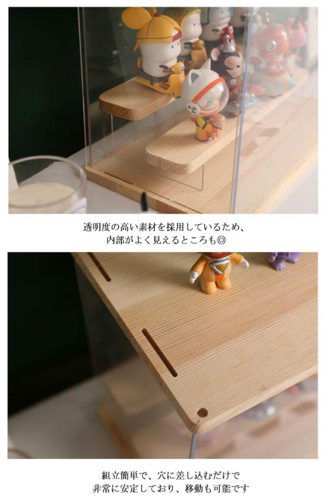 | コレクションのディスプレイにオススメのショーケースが新登場。 前面が開閉できるため、コレクションの出し入れや入れ替えがスムーズに行えます。 透明度の高い素材を採用しているため、内部がよく見えるところも◎ 段差のデザインで一つ一つがよく見えるので、中の物体をはっきりと鑑賞できます。 組立簡単で、穴に差し込むだけで非常に安定しており、移動も可能です | |