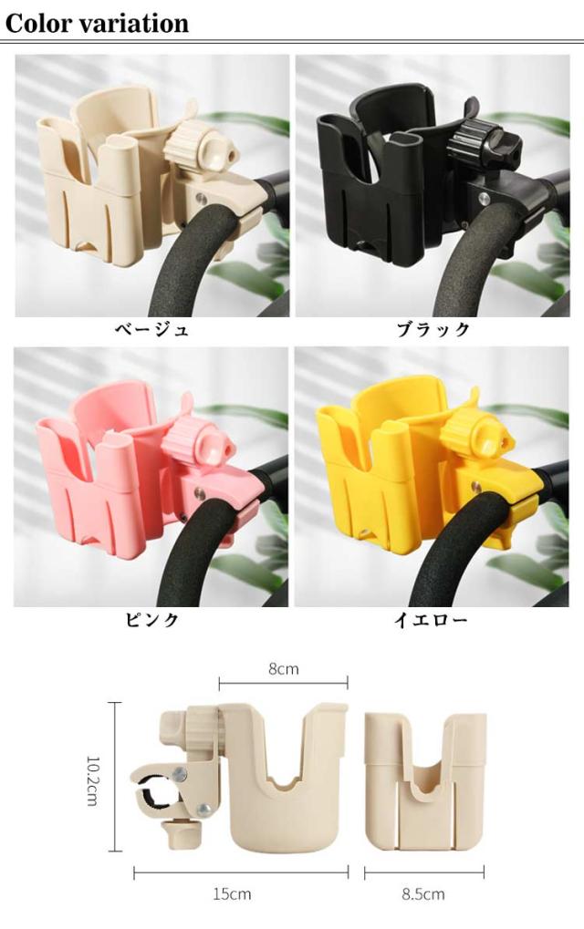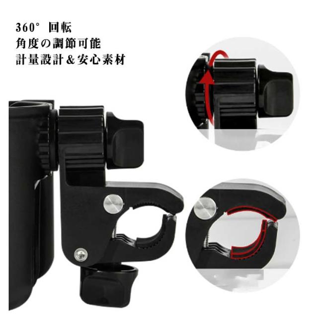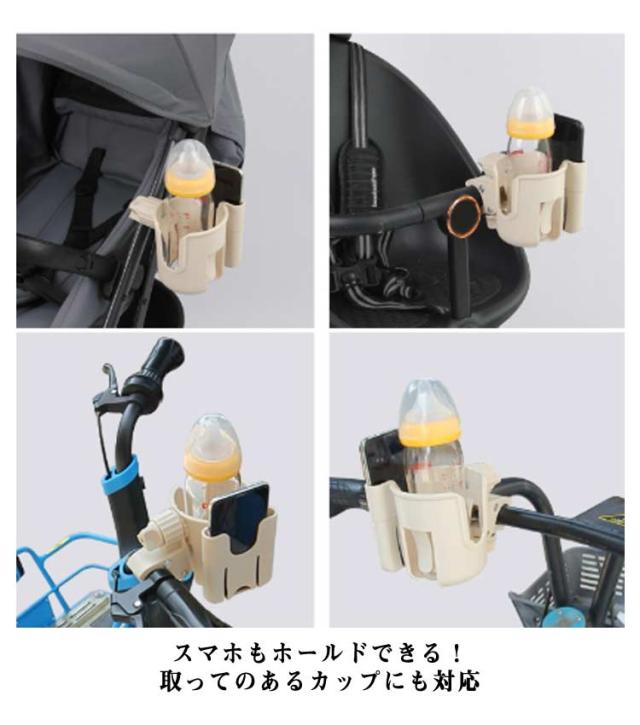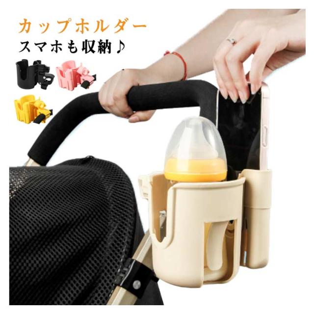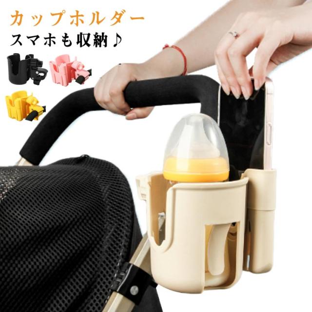 ベビーカー ドリンクホルダー スマホホルダー付き ボトルホルダー カップホルダー 取り付け 簡単 サドル シンプル 収納 ペットボトル 飲み物 ドリンク ベビーマグ カフェ 哺乳瓶 水筒 360度回転 便利 収納便利 携帯電話収納 軽量 水分補給