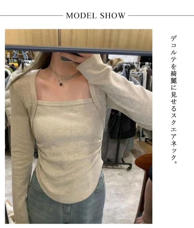 カットソー トップス 長袖 スクエアネック アシメトリー裾 Tシャツ レディース 重ね着風 春 秋 冬 無地 韓国風 ファッション インナー ティシャツ シンプル グレー きれいめ カジュアル かわいい 大人可愛い 送料無料