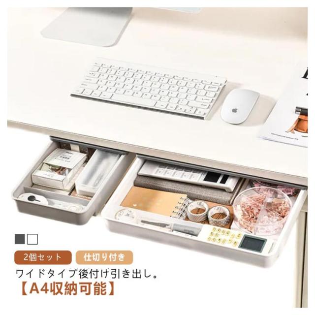 2個セット デスク下 後付け 引き出し A4 ワイド 仕切り付き 机下 テーブル下 収納 引き出し 収納ケース 収納トレー 浅め 引き出しケース オフィス 文房具 事務用品 キッチン メイク 小物入れ 小物整理 粘着式 デスク下 取り付け 引出し 不透明