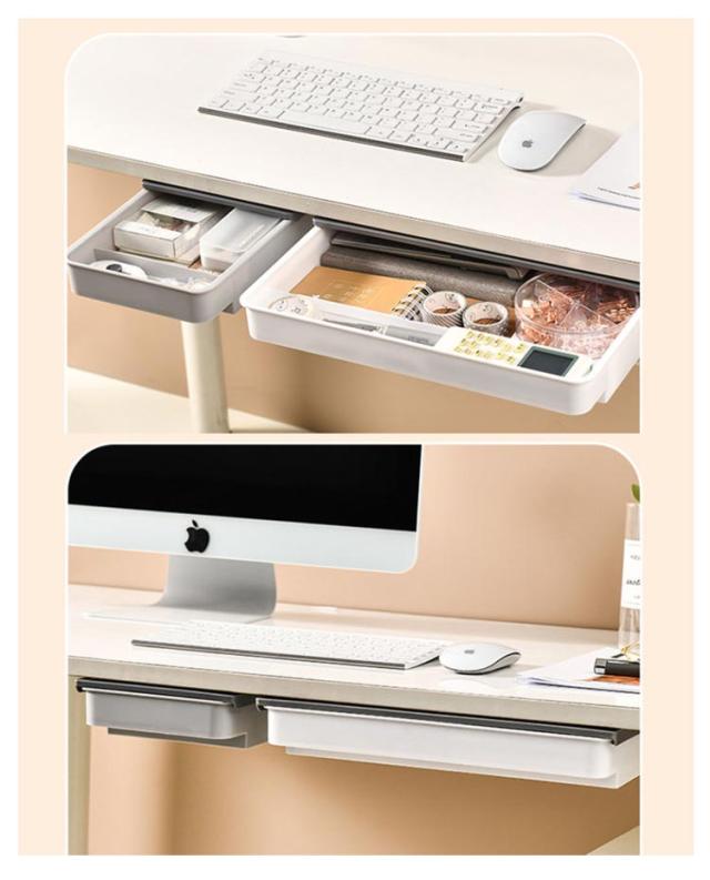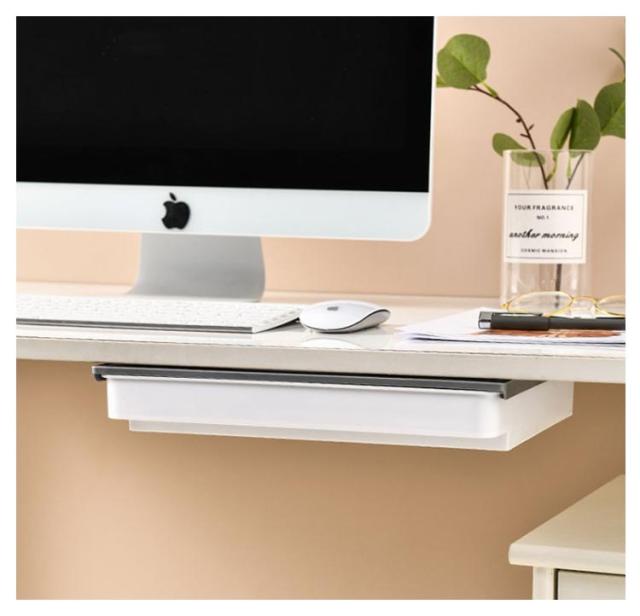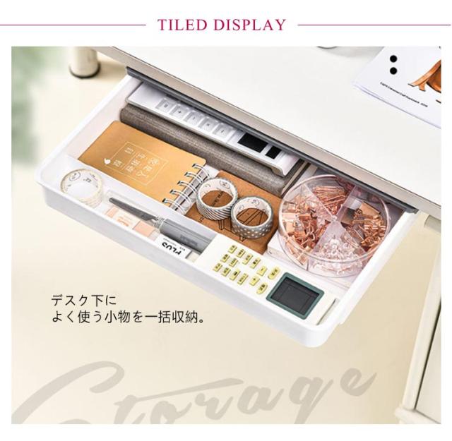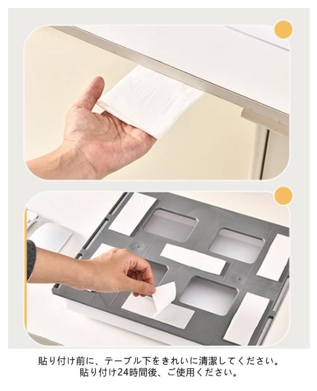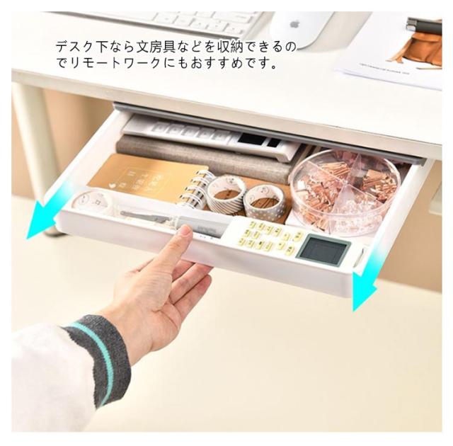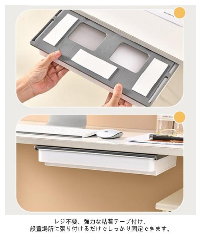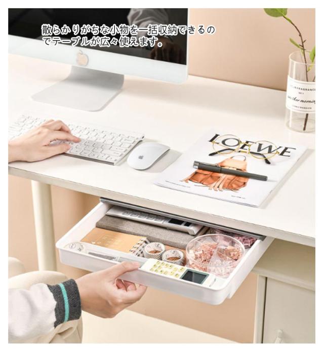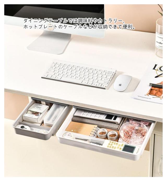 | ワイドタイプ後付け引き出し。【A4収納可能】【2個セット】【仕切り付き】 デスク下によく使う小物を一括収納。 散らかりがちな小物を一括収納できるのでテーブルが広々使えます。 ダイニングテーブルでは調味料やカトラリー、ホットプレートのケーブルなどが収納できて便利。 デスク下なら文房具などを収納できるのでリモートワークにもおすすめです。 レジ不要、強力な粘着テープ付け、設置場所に張り付けるだけでしっかり固定できます。貼り付け前に、テーブル下をきれいに清潔してください。*貼り付け24時間後、ご使用ください。 | |