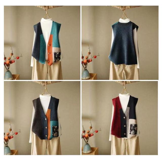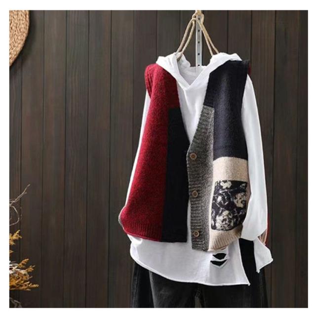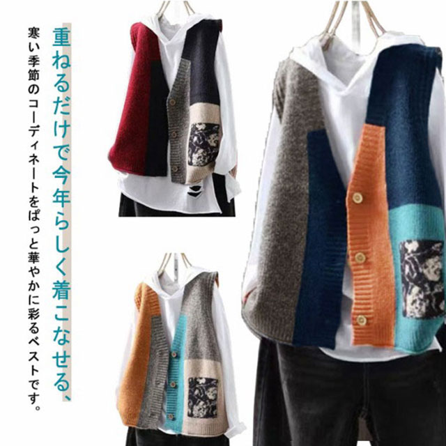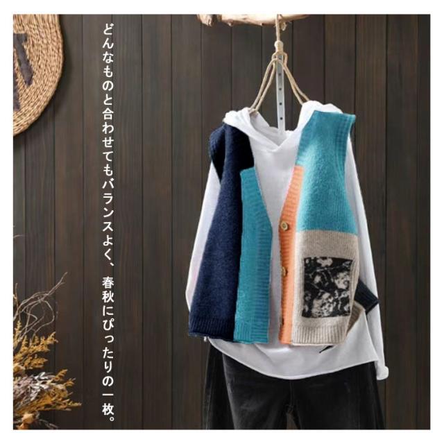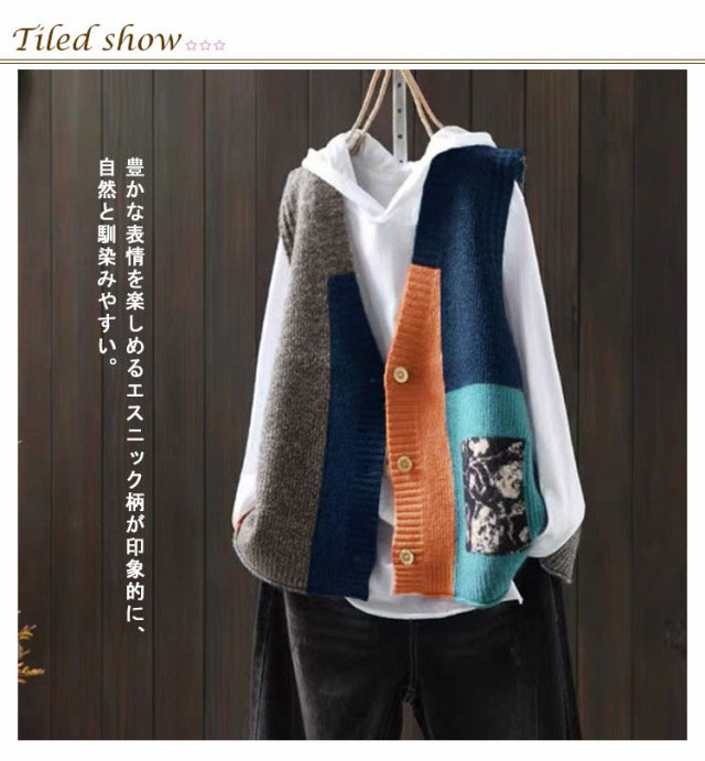 ベスト エスニック柄 ニットベスト レディース 前開きベスト ゆったり カラフル ニット セーター 羽織り 春 秋 トレロ 可愛い