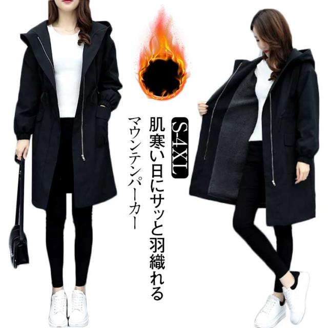 マウンテンパーカー レディース ロング丈 秋冬 裏起毛 フード付き 防風 防寒 コート 裏地あり 羽織 アウター カジュアル おしゃれ ゆったり 大きいサイズ 通勤 シンプル 無地 暖かい プレゼント ギフト 送料無料 前開き ジップアップ アウトドア