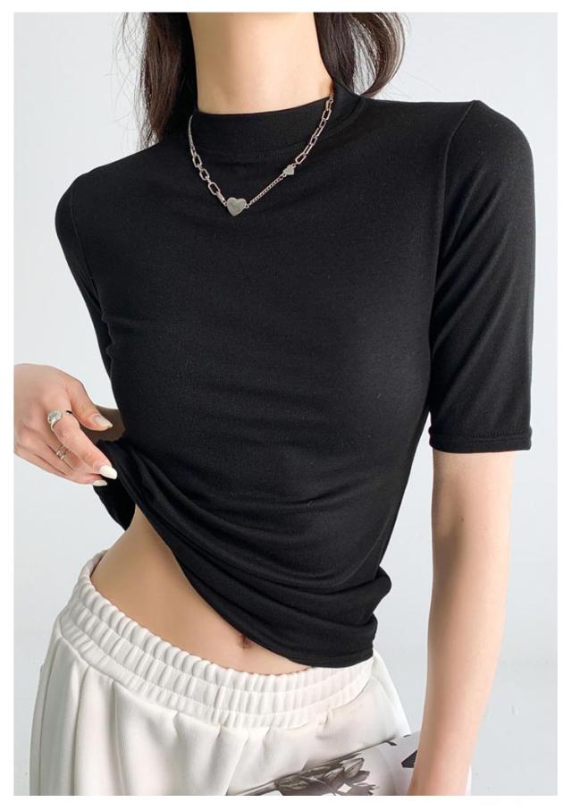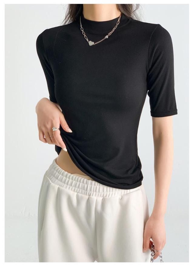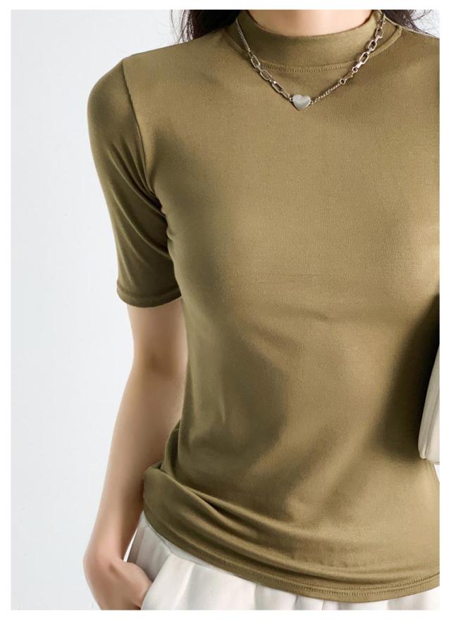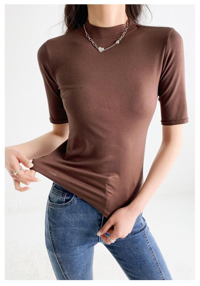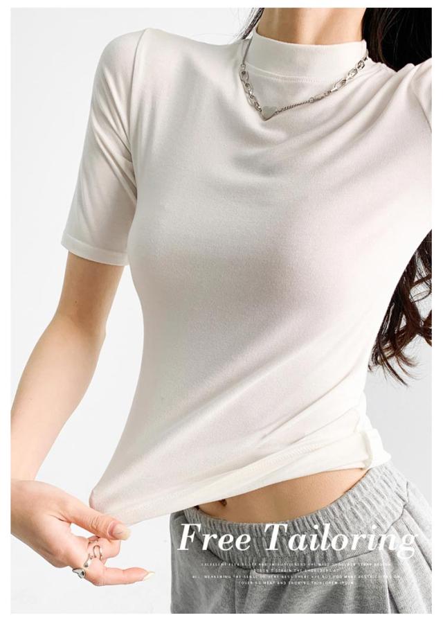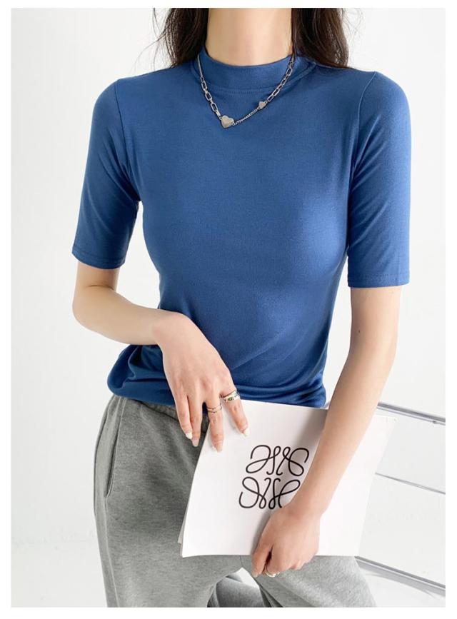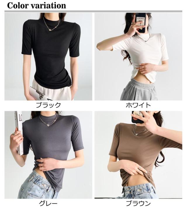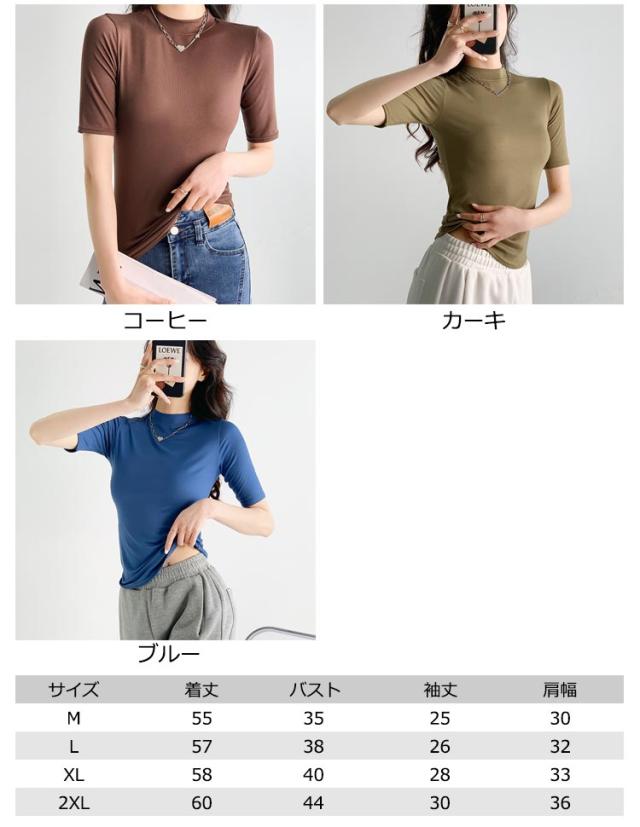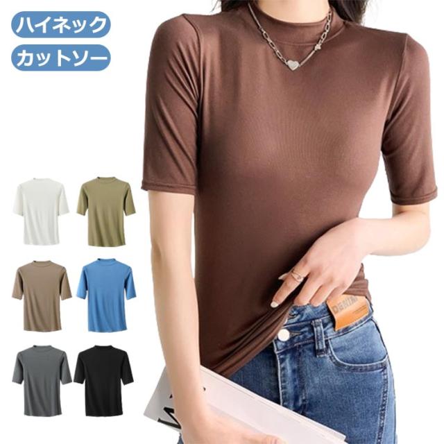 ハイネック カットソー きれいめ Tシャツ カットソー レディース 半袖 5分袖 トップス 紺 春 夏 春夏 無地 チュニック ハイネック 大人 20代 30代 40代 OL ママ 母 シンプル コットン 春服 あき冬 夏服 日焼け対策