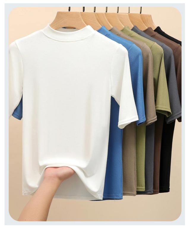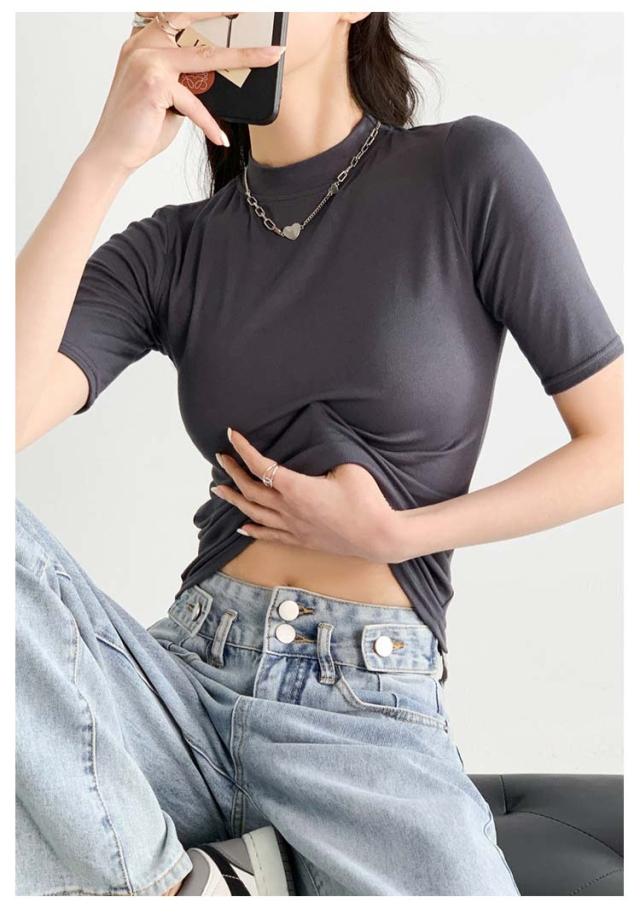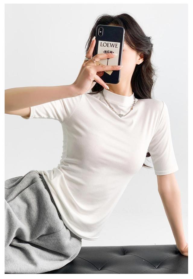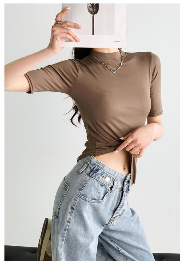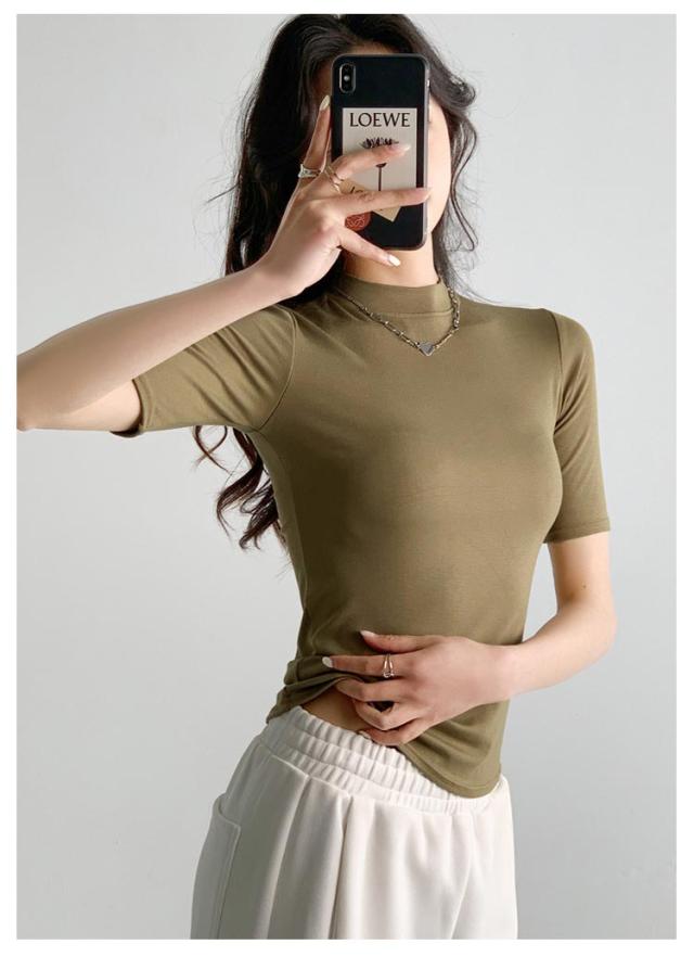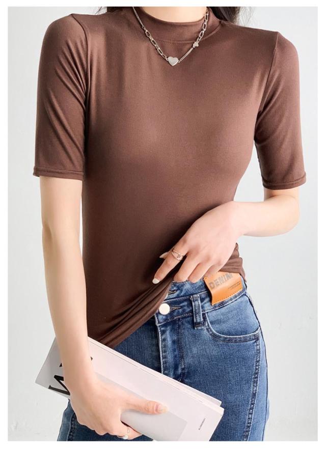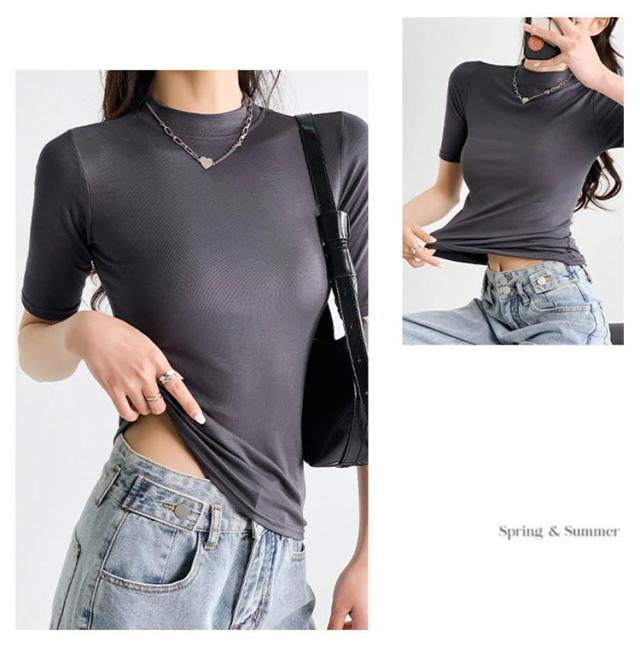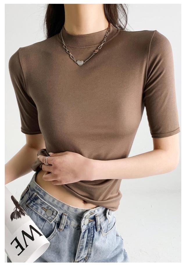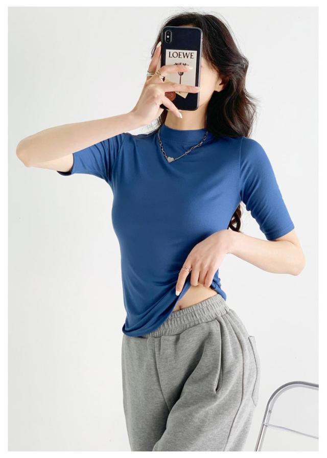 ハイネック カットソー きれいめ Tシャツ カットソー レディース 半袖 5分袖 トップス 紺 春 夏 春夏 無地 チュニック ハイネック 大人 20代 30代 40代 OL ママ 母 シンプル コットン 春服 あき冬 夏服 日焼け対策