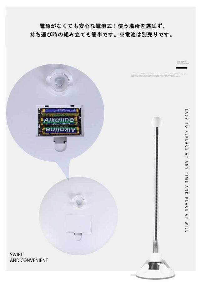 | 【10倍拡大鏡】アイラインが引きやすく・細かな毛穴までしっかりカバーできる大人気のメイク拡大鏡です!10倍の拡大鏡はうぶ毛や毛穴・眉毛のお手入れの際に重宝します!産毛、毛穴、皺、つけまつげのチェック、コンタクトレンズの装着、アイメイクなどは今よりもより簡単に手軽に出来るようになります! 【360度自由回転】化粧鏡は360度自由に回転することができ、好みの位置や角度に調節が出来ます。マスカラなど、メイク中に鏡の角度を変える際には、鏡をその都度セッティングする必要がなくなり、忙しい朝でもスムーズにメイクをすることができます。 【シンプル設計】根元部分をひねるだけで吸盤の着脱が出来るため、とってもシンプル!吸着力も強くて安心してお使いいただけます。陶器、大理石、アクリル、磁器、エナメル、鏡、浴室の壁など、平面の上に固定をしてください。また、水洗いで、繰り返し利用でき、長時間の利用でも使うことが出来ます。 【円形LEDライト】鏡の周辺には円形のLEDライトが付いており、暗い場所や夜でも綺麗にメイクすることできます。 電源がなくても安心な電池式!使う場所を選ばず、持ち運び時の組み立ても簡単です。※電池は別売りです。 | |