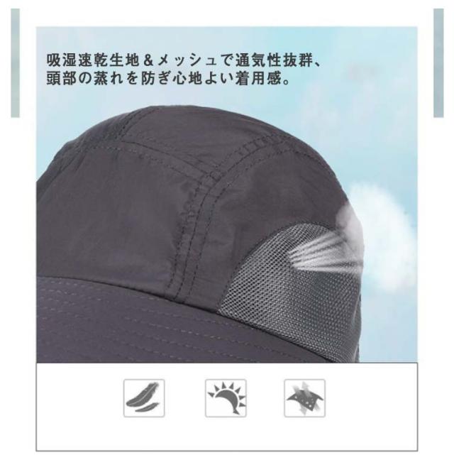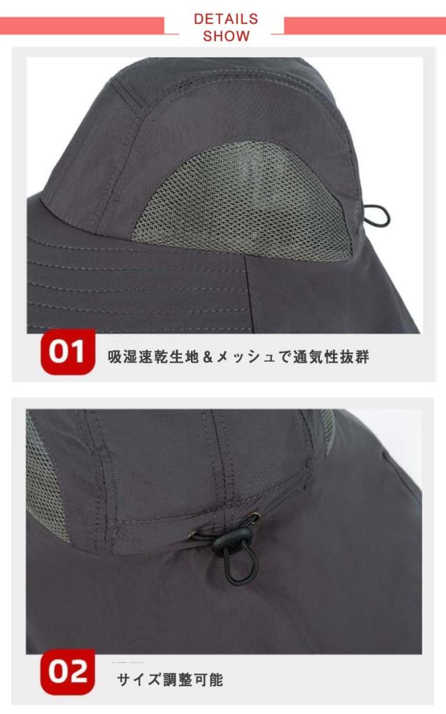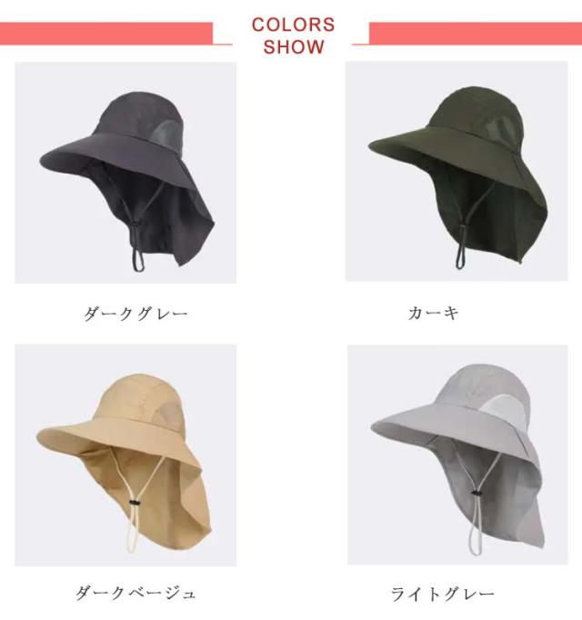 | 首筋までしっかりガードできる多機能日よけ帽子! 大きなつばと日除け垂れが日差し・紫外線をしっかりガード! 吸湿速乾生地&メッシュで通気性抜群、頭部の蒸れを防ぎ心地よい着用感。 アジャスター付きのあご紐。頭部アジャスター付。 軽量設計で、持ち運びにも大変便利です。 男女兼用で使用できるシンプルなデザイン♪ 日除け・紫外線対策に大活躍!! | |