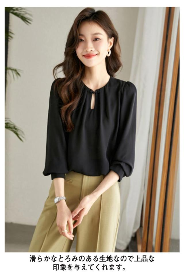 送料無料 シフォンブラウス レディース シャツブラウス 長袖 シフォンシャツ ノーカラー スーツ インナー プルオーバー シンプル 無地 とろみシャツ シフォン きれいめ オフィス 通勤 エレガント 大人 かわいい おしゃれ